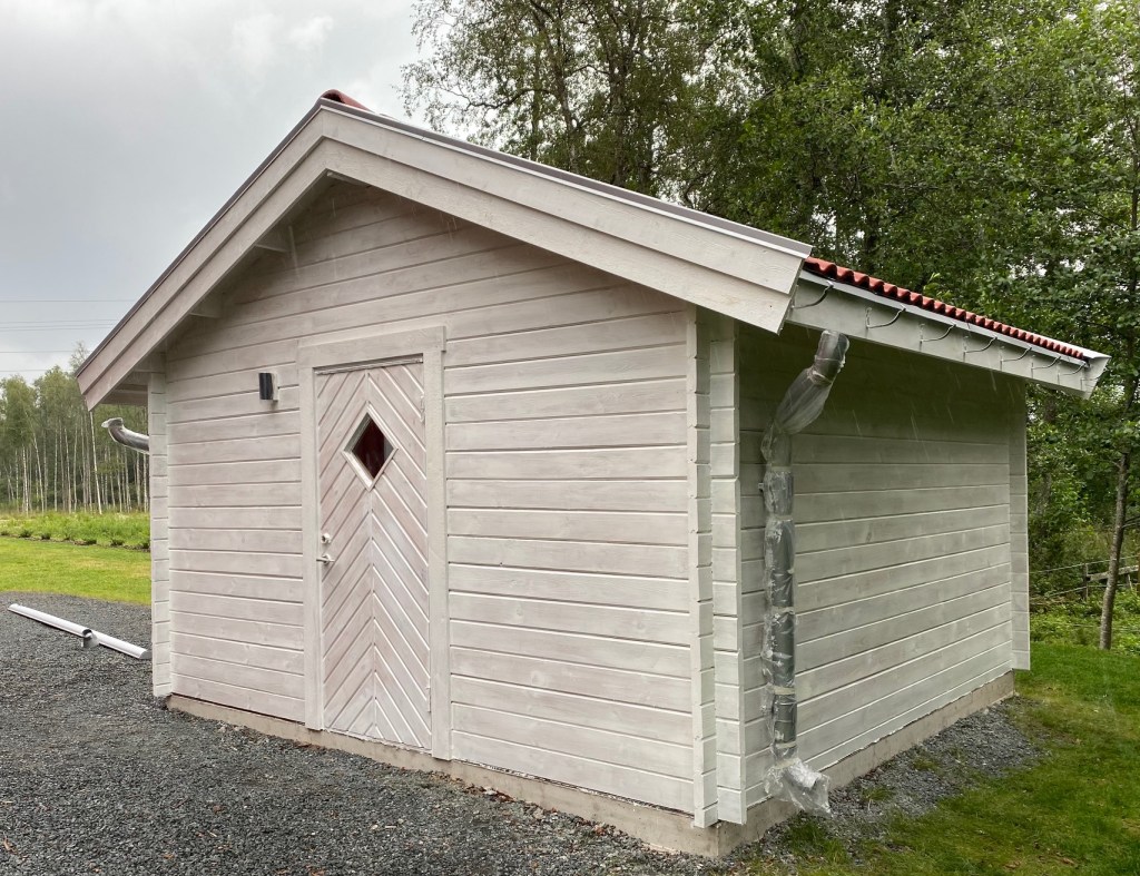 Tack snälla Birgitta för att du har hjälpt mig att måla vår bod. Det ser inte ut som något stort jobb. Väggarna är enkla att måla och det fixade Birgitta det mesta av. Själv stod jag på en stege i alla möjliga vinklar och målade takfoten. Denna strykningen var med grundfärg. Före detta har vi oljat in allt trä. Nu återstår två strykningar till, med vit och röd färdig färg. Det gick åt hela tio liter färg idag. Färgen bara sög in i träet. Hittills har vi målat 20 timmar. Klarar vi det på 20 timmar till, har vi tjänat in en rejäl timpenning.