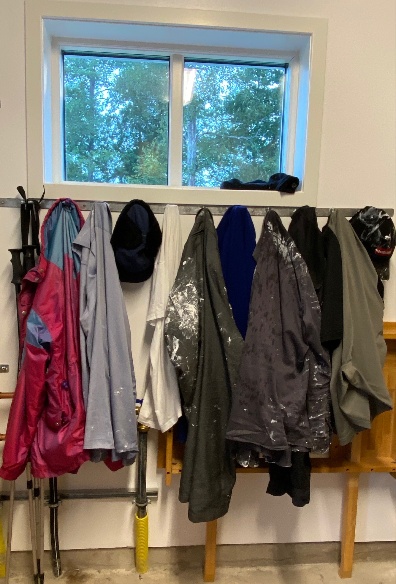 Jag skruvade upp mitt tidigare skidställ med krokar på en vägg, för att hänga upp av alla min grovarbetar- och målarkläder. Jag har en stol att sitta på, matta på golvet och en massa krokar att hänga av mig våta och smutsiga kläder. Det vore inte roligt att komma in med målarkläder i vårt fina hus. Detta är mitt sätt att bygga lite extra lyxigt.