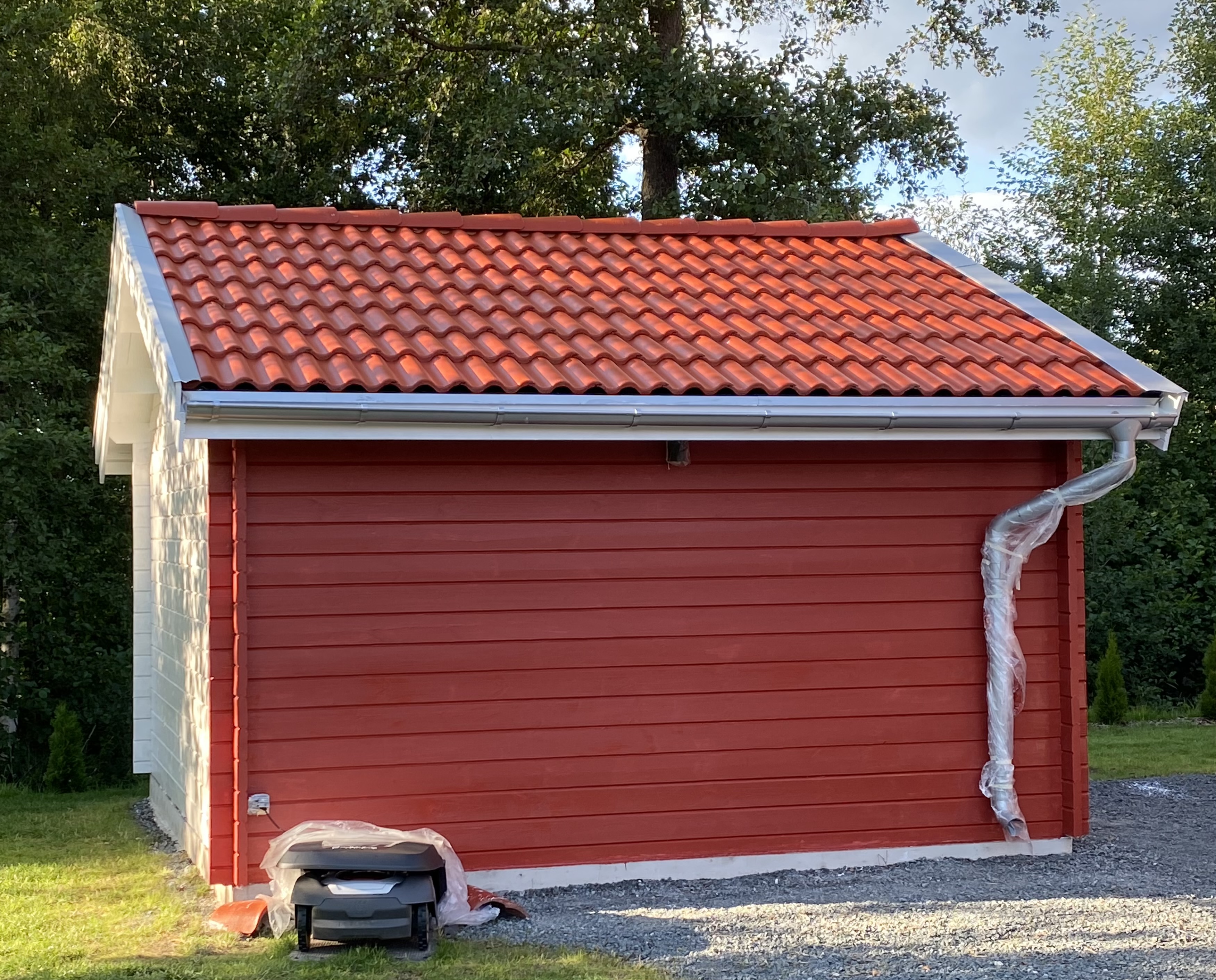 Färgen är föreskriven i bygglovet. Den är matt ladugårdsröd, för att passa in i en lantlig miljö. En högblank Demidekk fick jag inte måla med och det hade inte passat, i mitt gårdsbygge ute på landet. Allt det vita är struket fyra gånger. Nu har jag strukit en långvägg med rött en gång. Sedan en gång till innan det är klart. Det var ett ganska stort jobb att ge sig på, när jag jobbar sju till fem varje dag. Numera orkar jag inte lika mycket som förr.
