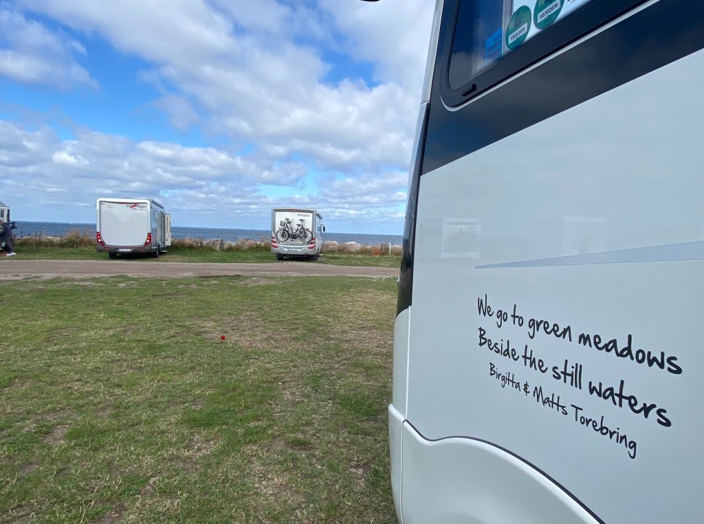 Borgholms ställplats som vi står på, är fylld till sista platsen när jag skriver. HERDEN har återigen fört oss till gröna ängar vid stilla vatten