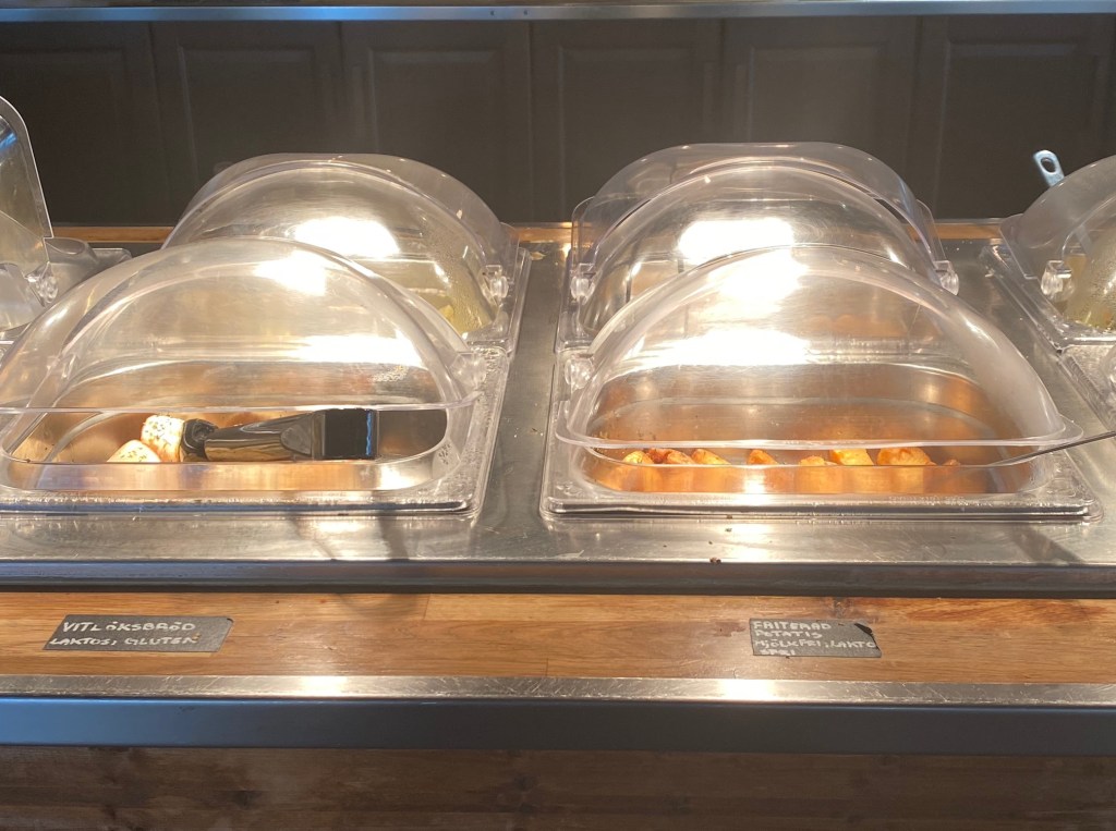 Detta var bland det bästa jag sett, suveränt smidiga lock att bara fälla upp och ned över alla maträtter. Så mycket mat så det gick inte smaka på allt, flera kött- & fiskrätter, stor salladsbuffé, sju sorters kakor och smulpaj med vaniljsås och kaffe till avslutning.