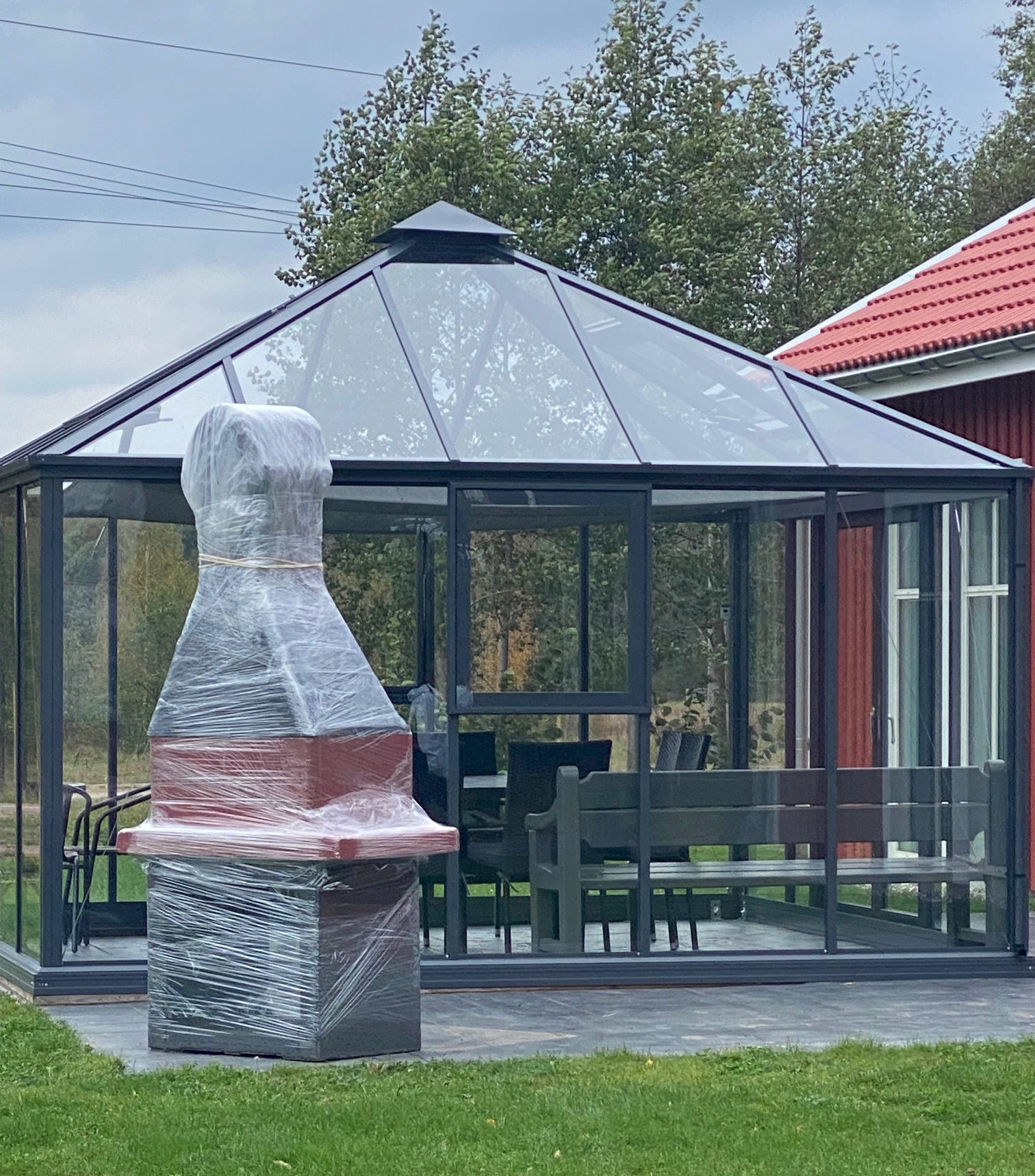 Utegrillen är inplastad hemma för att inte frysa sönder i vinter.