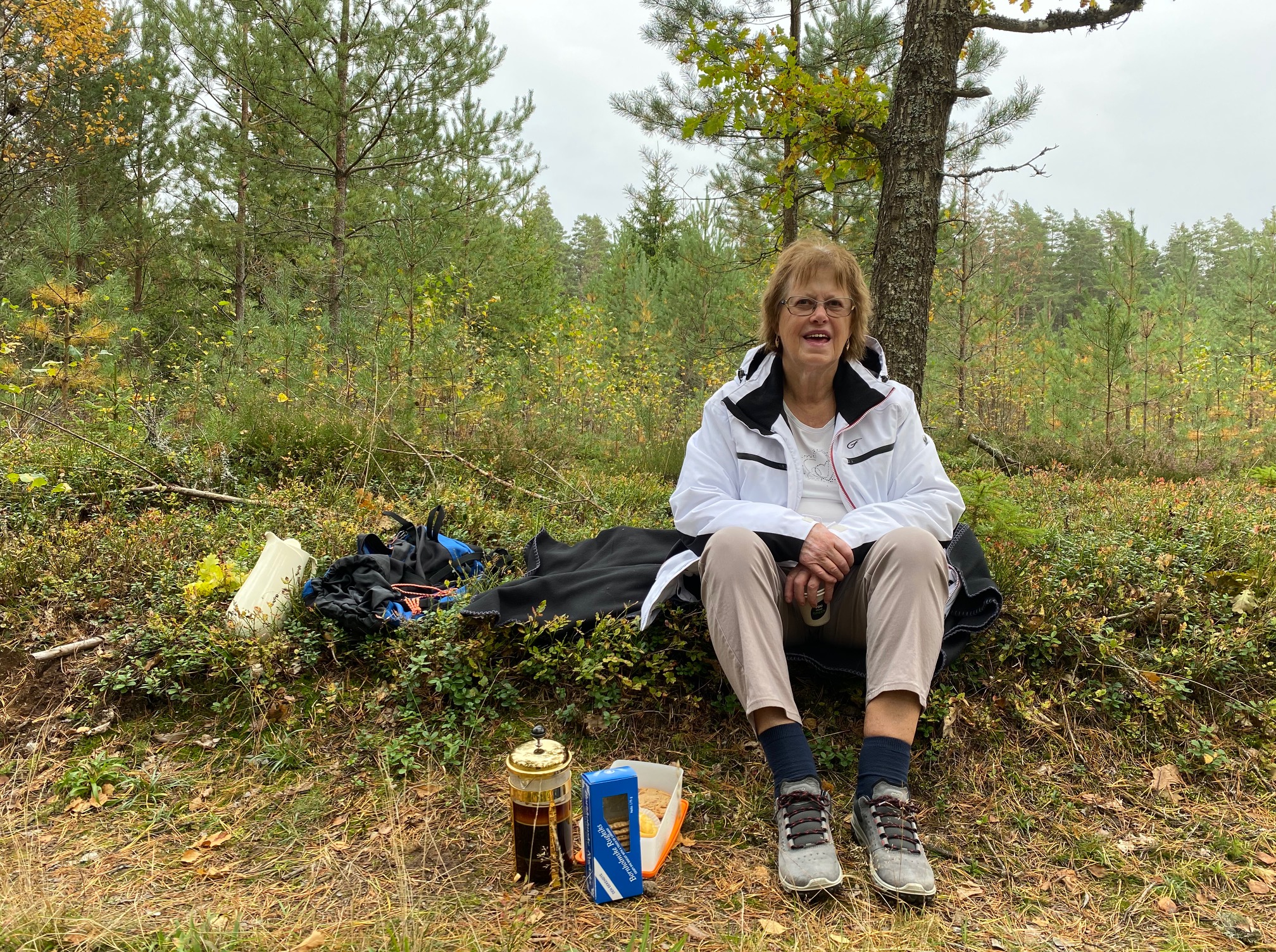 När vi gått 2/3 delar av sträckan stannar Birgitta och säger: ”Nu vill jag fika och gå hem sedan.” Oftast lyder jag Birgitta och gör som hon säger, så även denna gång. Vi hittade en liten ”hylla” och bredde ut en pläd att sitta på, njöt av tystnaden, ett gott fika och sedan gick vi sakta hem.