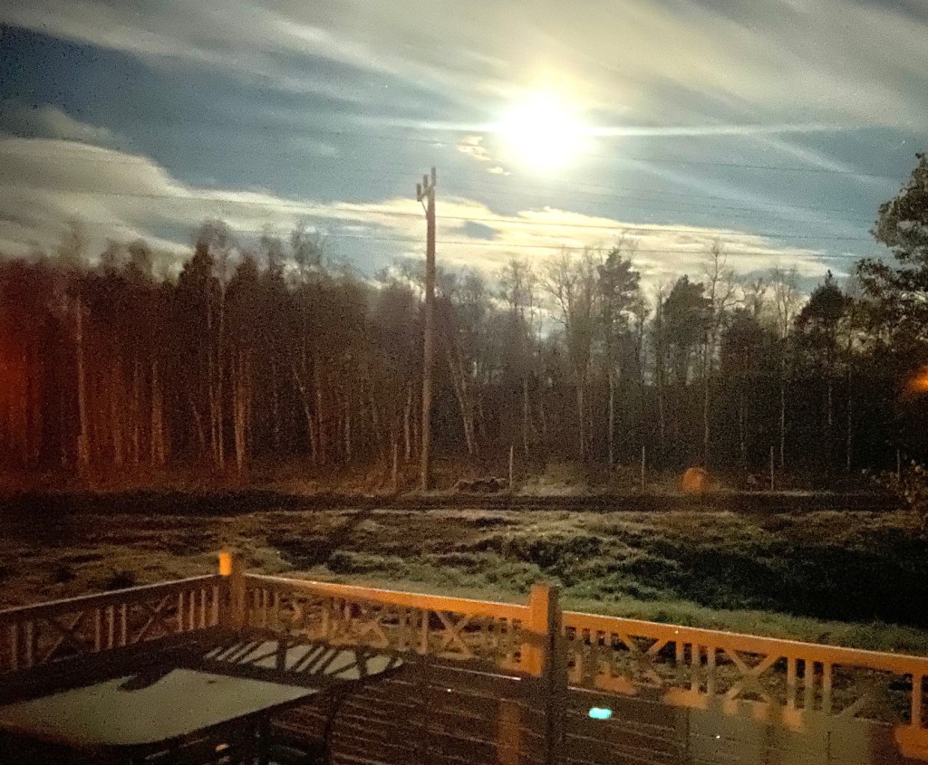 När jag tog en kort sovpaus vid kl. 2 i natt, tolv timmar senare efter det att vi hade gått ned till stranden på söndagseftermiddagen, då lyser månen upp hela gården. Jag var för trött att larma av, låsa upp, gå ut samt att det var -6 grader ute, så det blev ett kort inifrån vardagsrummet. Som det står i min Bibel i Jeremia 31:35: ”Solen skall lysa om dagen, månen och stjärnorna om natten….” Det stämmer fortfarande.
