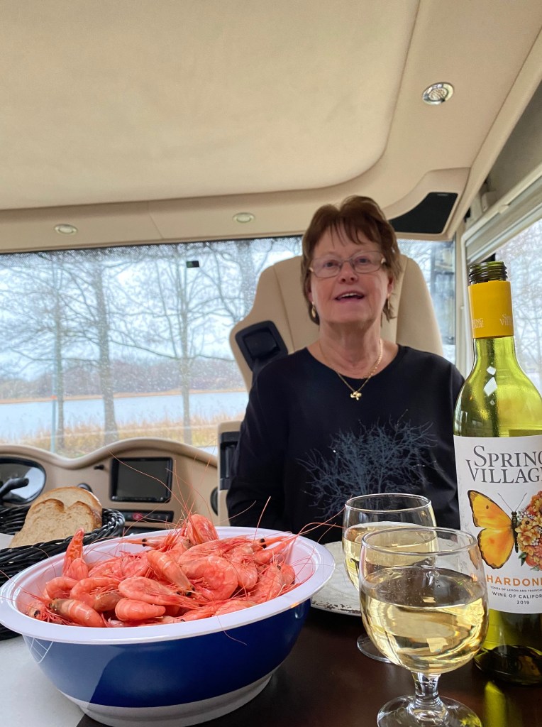 Så är vi hemma i bussen igen. De få gånger jag köper en flaska vin, letar jag alltid efter den amerikanska flaggan på flaskan. De har så söta och goda viner som ingen annan har. Detta var riktigt gott, Spring Village. Räkorna var bland de bästa vi köpt och så goda. Fanns knappast inte en enda räka utan massor av rom.