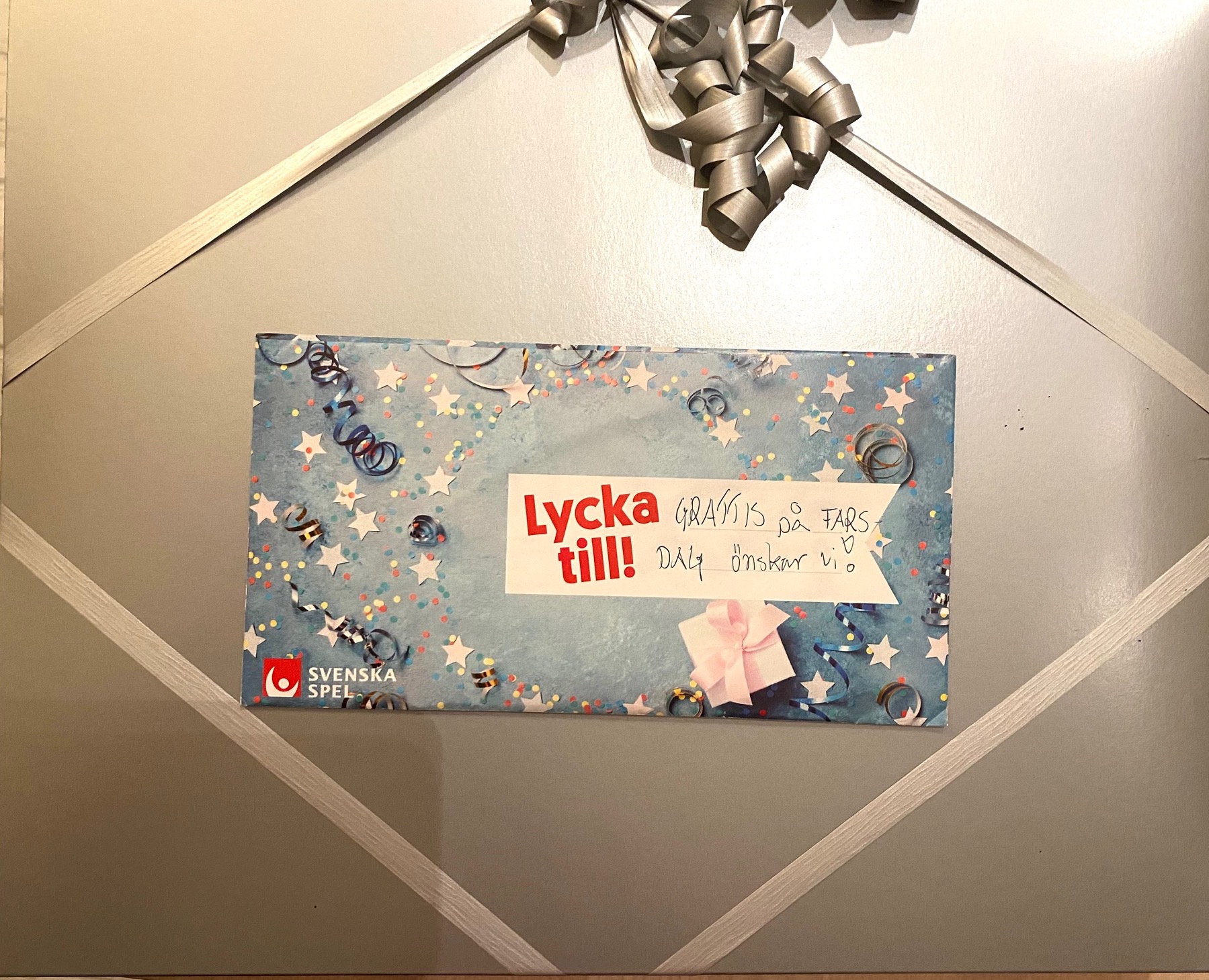 Någon gång måste det bli vinst säger Niklas, som troget under många år tillsammans med dottern Candra, gett mig detta kuvert. Linus brukar skrapa åt farfar och det blir spännande att se vad det blir i år. Det stora paketet och en stor kram fick jag av min bästa del, Birgitta.