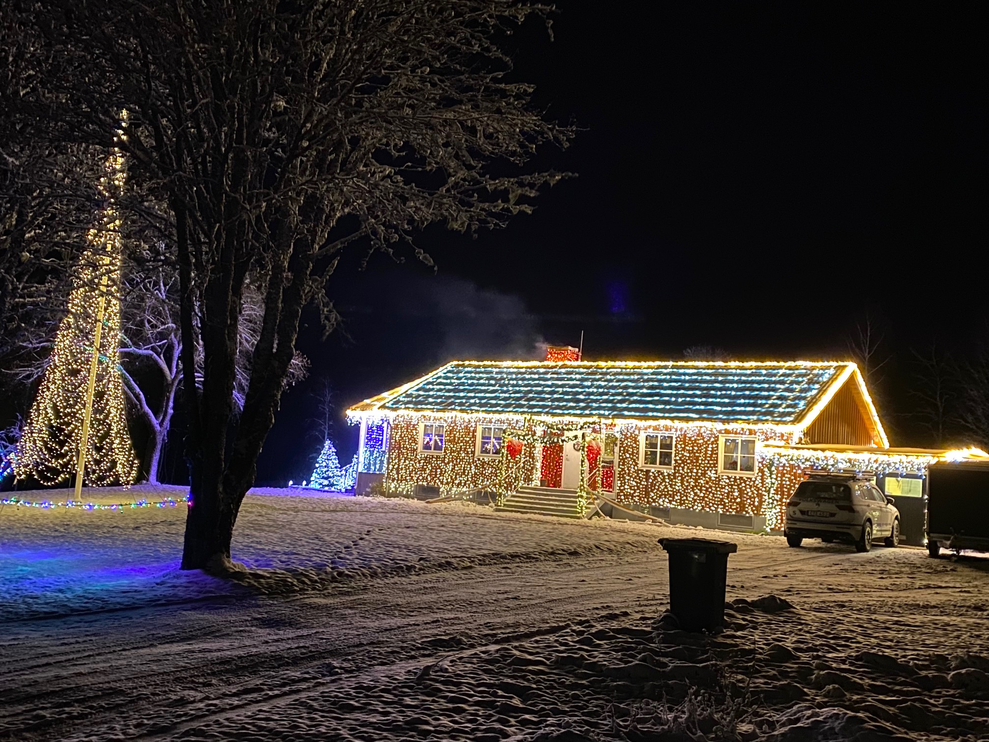Tack det var snällt sagt, detta var helt enkelt för mycket i min smak men vill man vara värst så blir det så här. Det första jag tänkte på lite avstånd, finns det en lucka i all belysning så man kan gå in i huset?