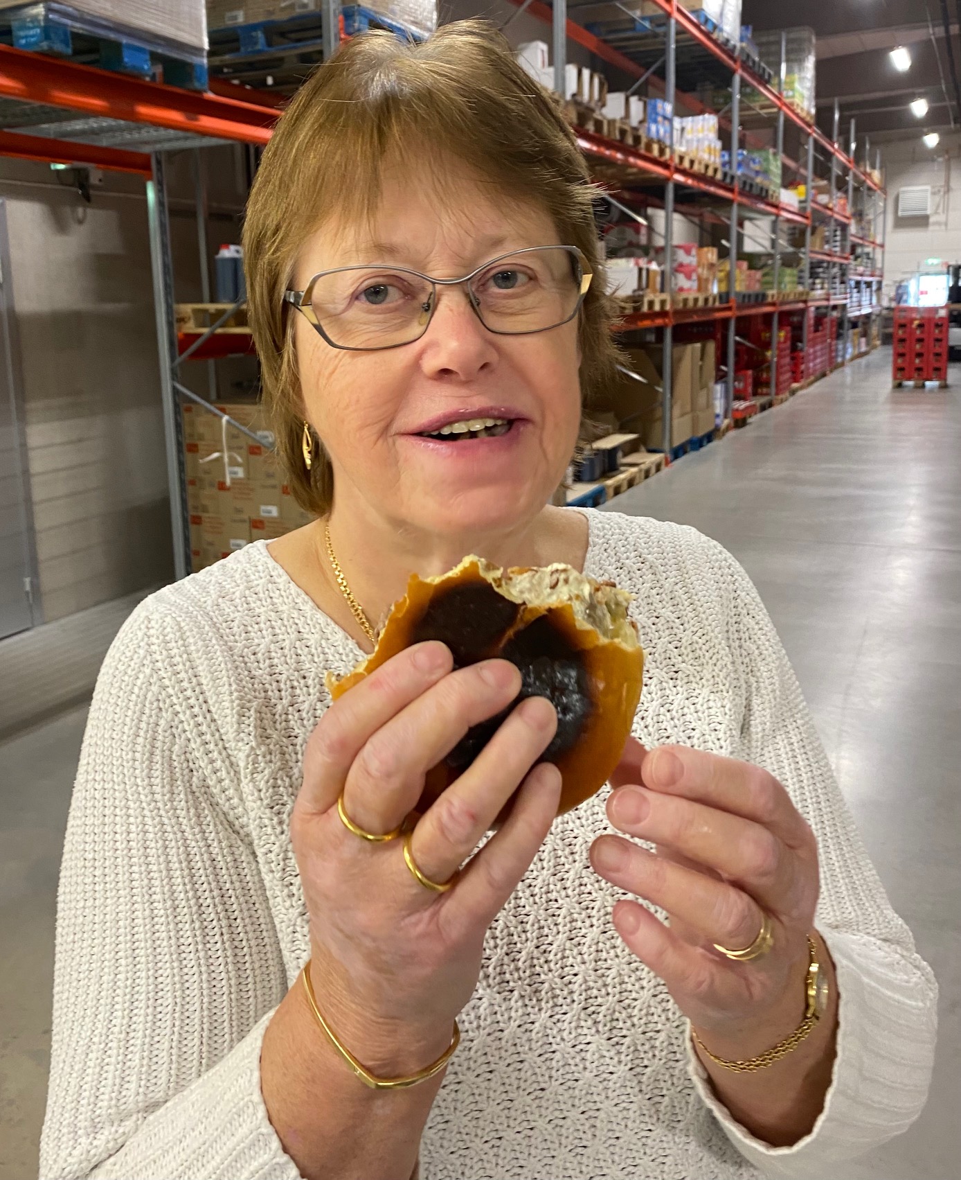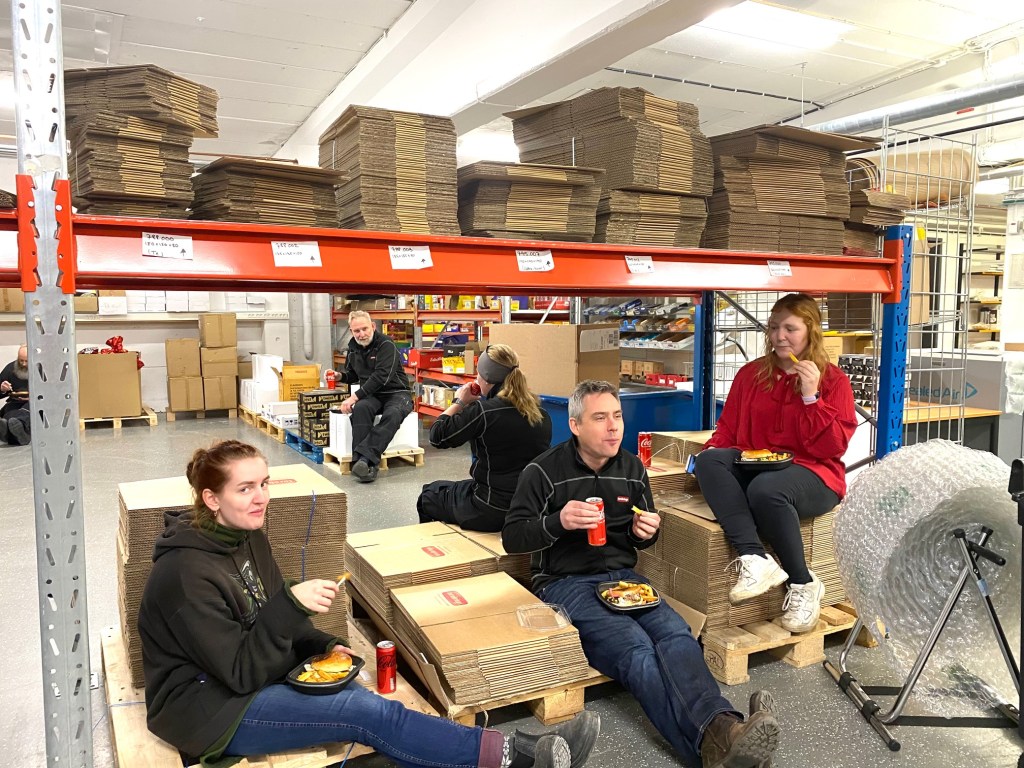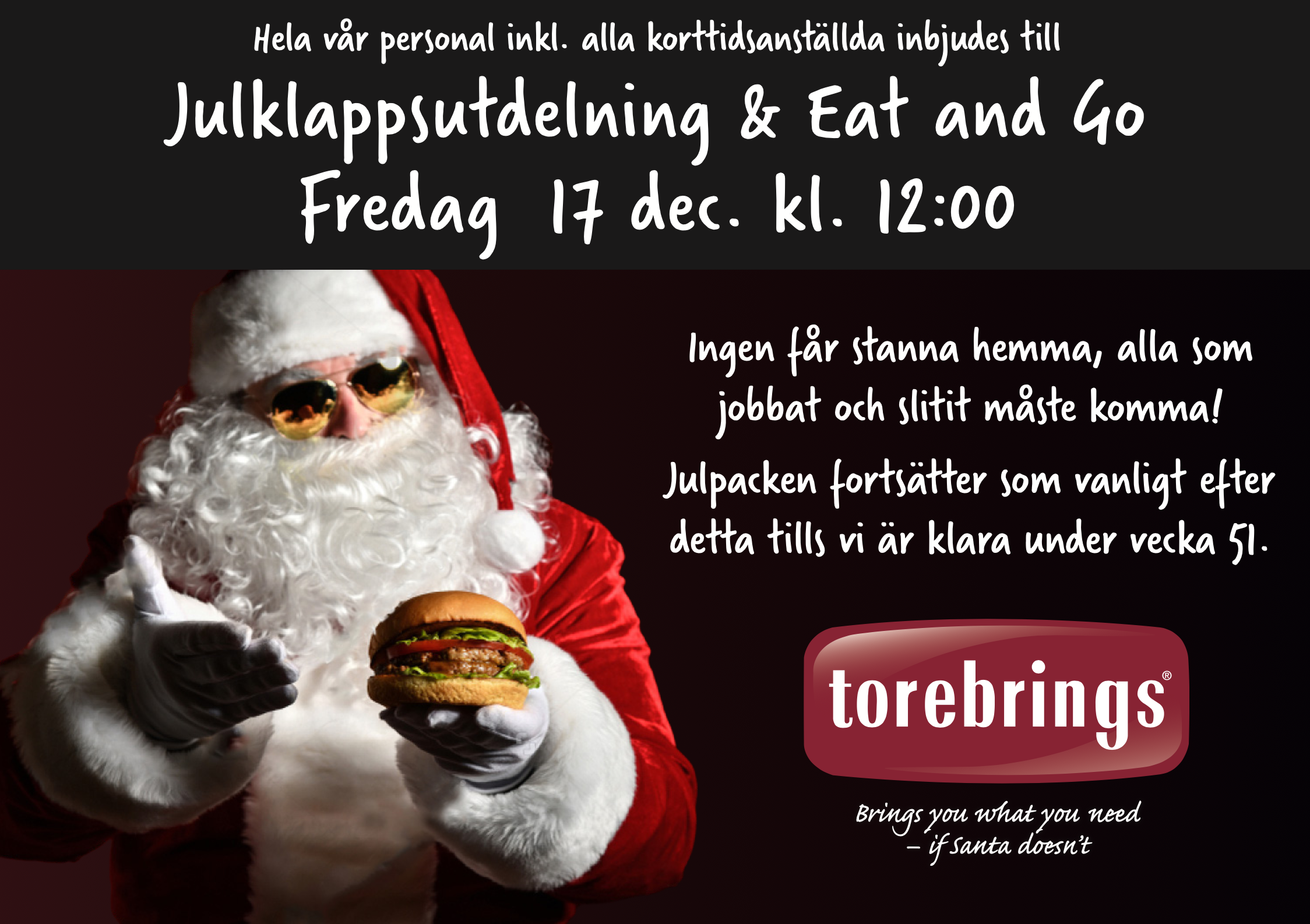 Inställda julbord på grund av pandemi, tiden att gå ut och äta med alla fanns inte, Tomteverkstaden har mycket jobb kvar, dela ut Tomtelådor dagen före julafton när alla är klara är ingen bra tid. Vad gör vi? Jo vi ringer till Restaurang Byn som finns på samma gata och beställer 42 styck 200 gr hamburgare. Inga bord, inga stolar, ingen dukning, snabbt, enkelt och mycket gott. Alla samlades hos vännerna i Packshop.