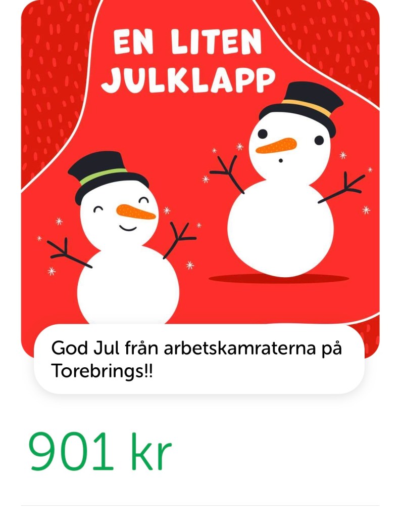 I många år har vi fått ett presentkort på en restaurang. Jag visste genom Birgitta att de gått runt och samlat in pengar. Jag frågade Niklas lite försynt om han fått något? ”Har du inte sett det på swichen,” sa han. Jo minsann där fanns det sedan en vecka tillbaka, men inte visste jag att man kunde swicha ett kuvert att öppna och att det kom fram 2 snögubbar med pengar.