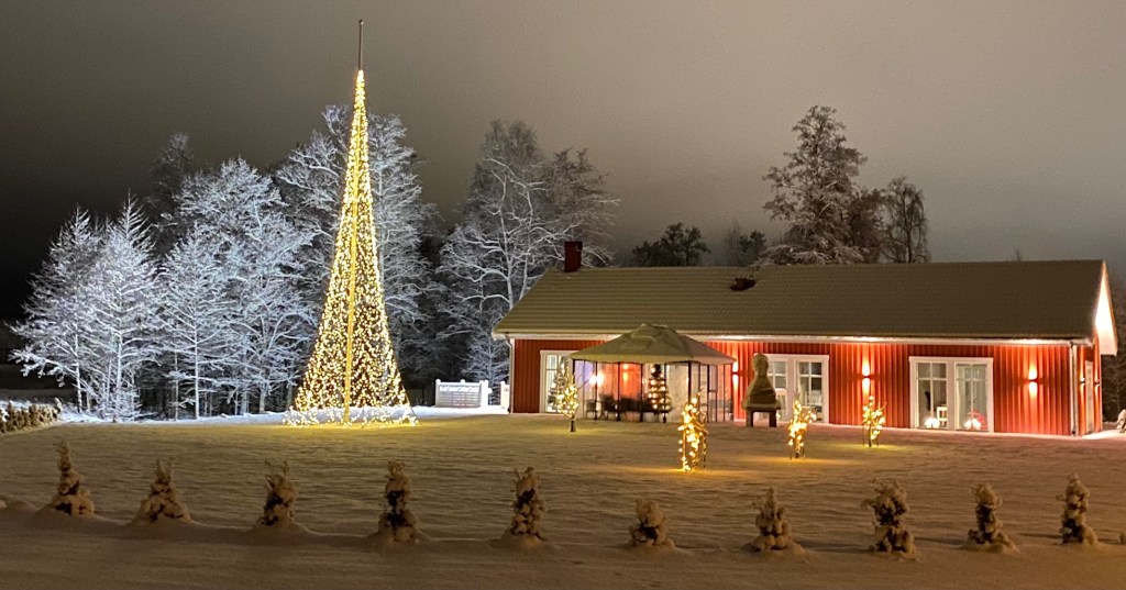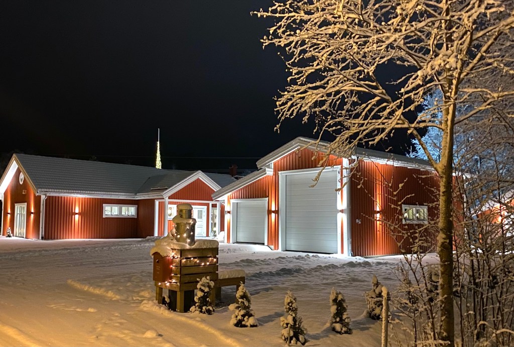 De kraftiga lampan på gaveln lyser upp ända ned till badviken och det blir extra vackert efter snöfallet på träden.
