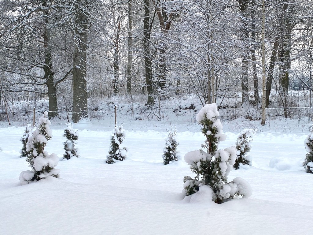 De fina ”granarna” ser trevliga ut med snöflingor på, ser ut att trivas. Så fint med den inramningen.