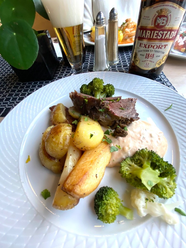 Så många gånger som vi gästat Vadstena, men aldrig varit inne och ätit mat på Restaurang Wasa. Ingen lyxig miljö men ändå prisvärt. Dagens rätt, Entrecote och klyftpotatis 100 kr. inkl. kaffe och kaka.