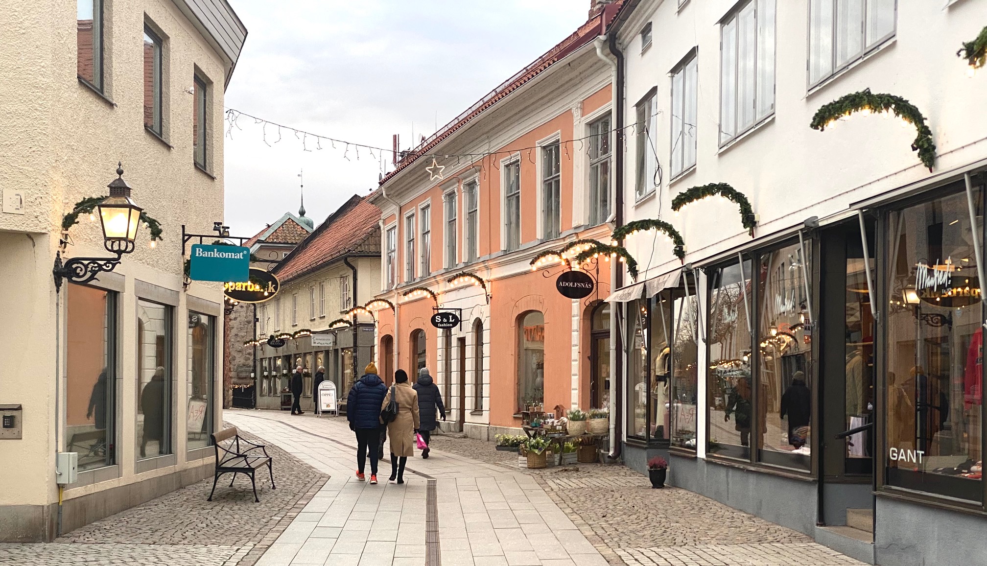 En riktigt trevlig gågata med många möjligheter till den bästa shopping, fika eller äta mat. Här lever julen fortfarande kvar.