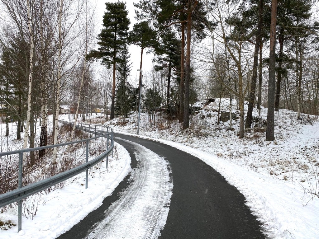 Denna veckan har bjudit på nästan alla typer av väder. Barmark, isgata, bitvis halka, lönnhalt och idag mildväder. Det blev 4 dagar med olika vädertyper varje dag. Visst älskar vi att tala om vädret med varandra och hur ofta säger vi inte efter en dm nysnö, ”Tänk om det kunde vara så här nu ett tag, när det är så vackert.” Det är inte så ofta det blir så. För mig är det fantastiskt, att ha flera olika och så här fina gång- & cykelvägar till jobbet. Det måste jag ge kommunen en eloge för.