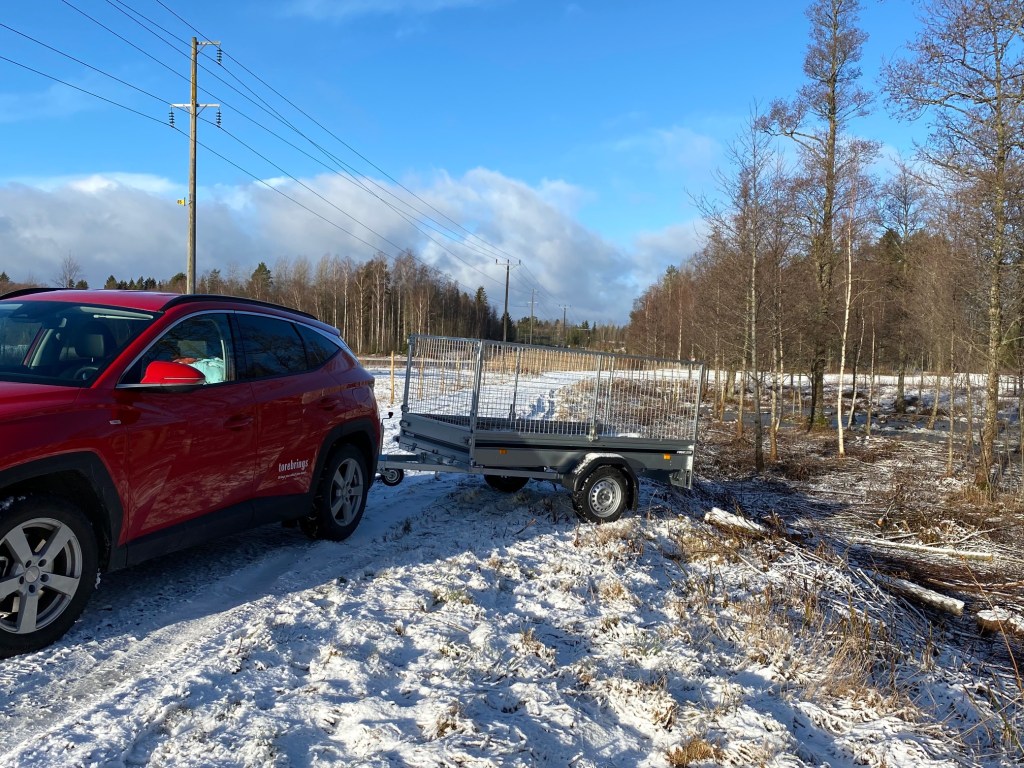 Jag önskade mig lite snö och några minusgrader, när jag skulle köra hem veden. Jag fick både och, samt solsken också. Jag hade en 2 meter brant slänt, för att få upp veden till nya släpkärran. Under hösten röjde vår gode Christer bort allt sly. Nu låg det på marken med lite snö och is på. Det gick knappt att stå upprätt, jag bara kanade åt alla håll. Det hade varit smidigare utan snö och (r)is.