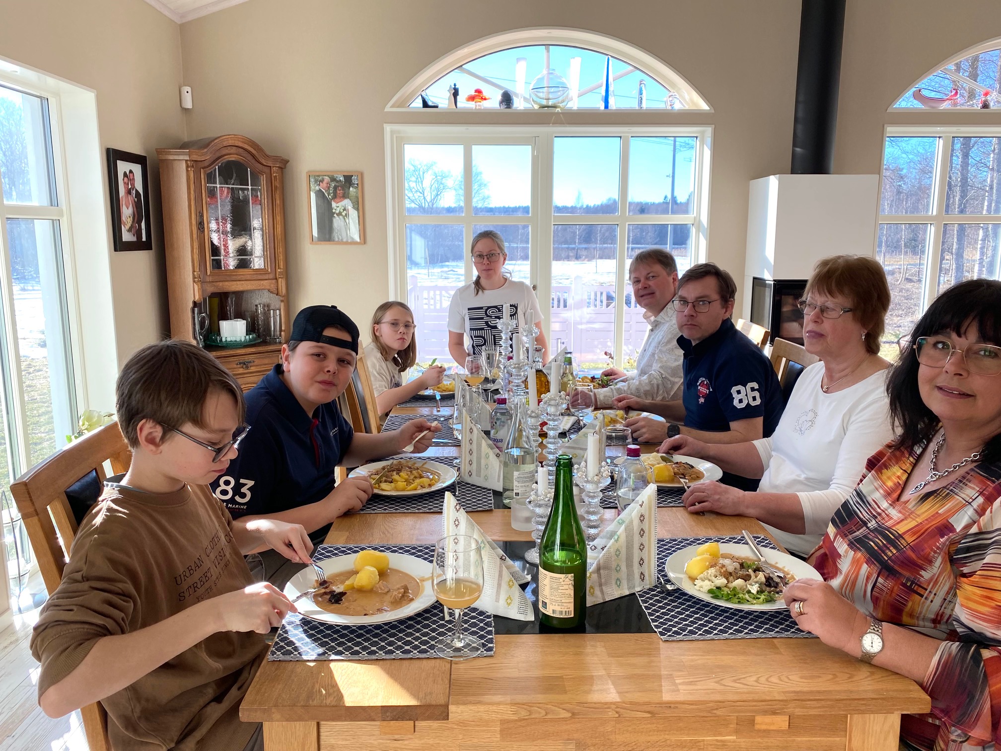 Det märks inte att vi är 9 personer runt bordet i vårt nya hem, det är så rymligt och alla umgås samtidigt även om någon pysslar i köket.