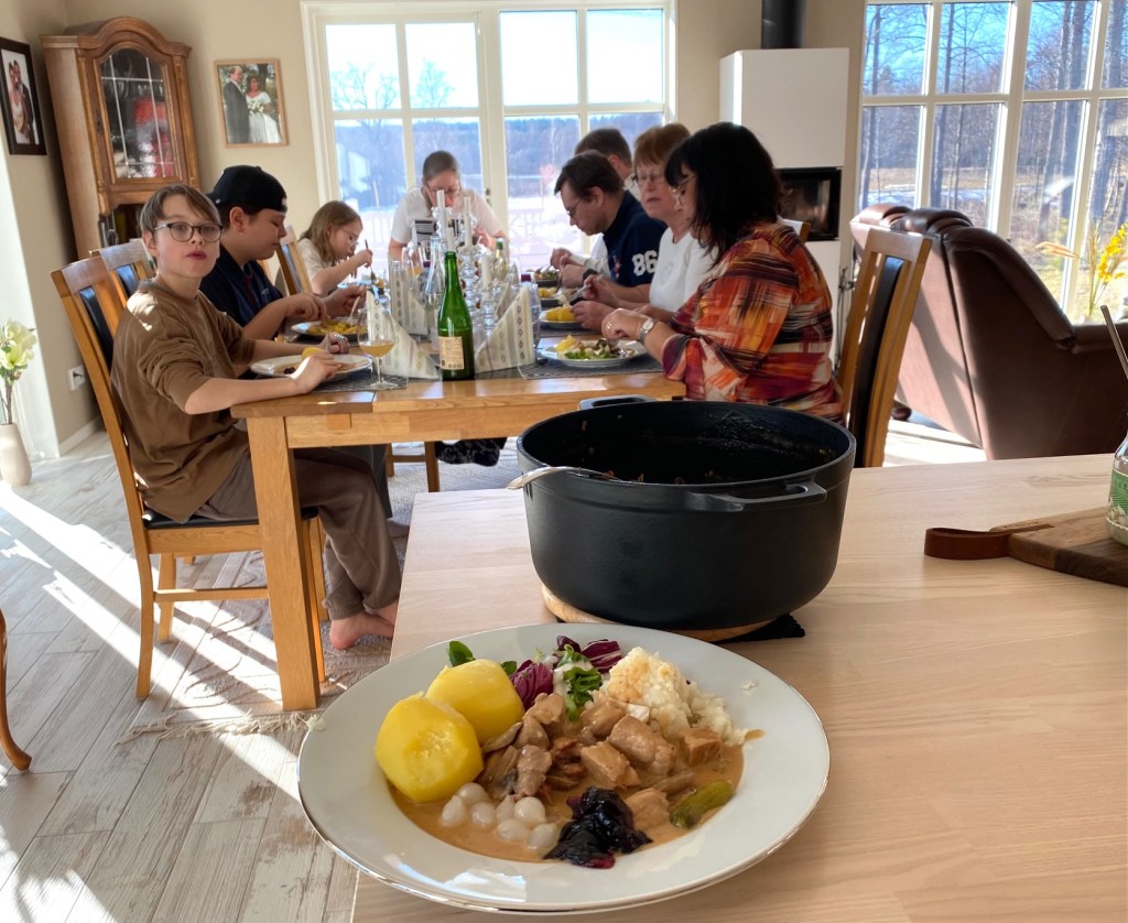 Birgitta hade lagt mycket gott i grytan utöver fläskytterfilé. Hon hade stekt och lagt till bacon, svamp, soya, grädde, creme fresch, hönsbuljong och chilisås. Bäst av allt är ändå att få träffas igen. Kanske mötte ni flera Tesla, varav en var vår dotter med familj. Vem vet när vi ses nästa gång, i en tid som denna?