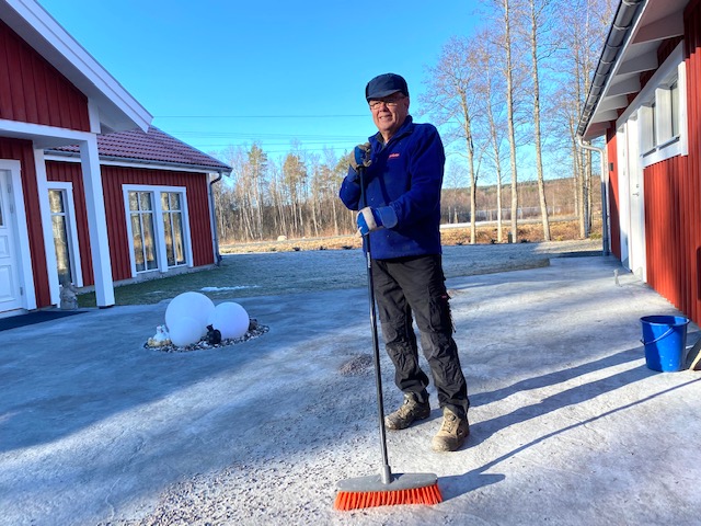 Vi hade mycket sand att samla upp, efter ett par isiga dagar för några veckor sedan. Vi kom igång ganska tidigt och Birgitta är med i arbetet ute. Hon har tid till det nu i nya huset, när allt är så lättskött inne och hon trivs framförallt med det och frågar ofta: ”Vad kan jag göra nu?”