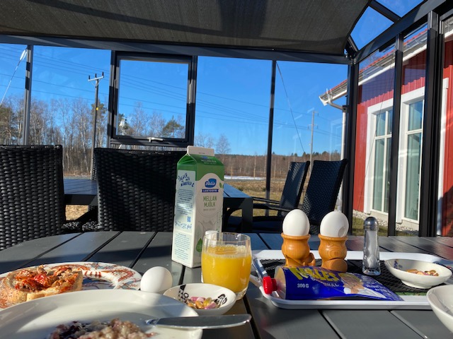 Efter en stund blev jag serverad frukost ute i Greenroom, som nu var jättevarmt i solskenet trots -8 grader på morgonen.
