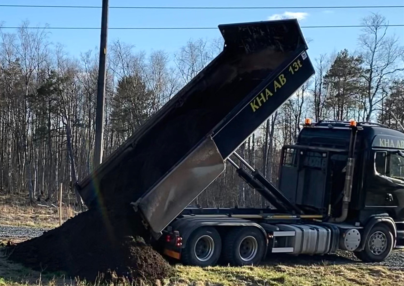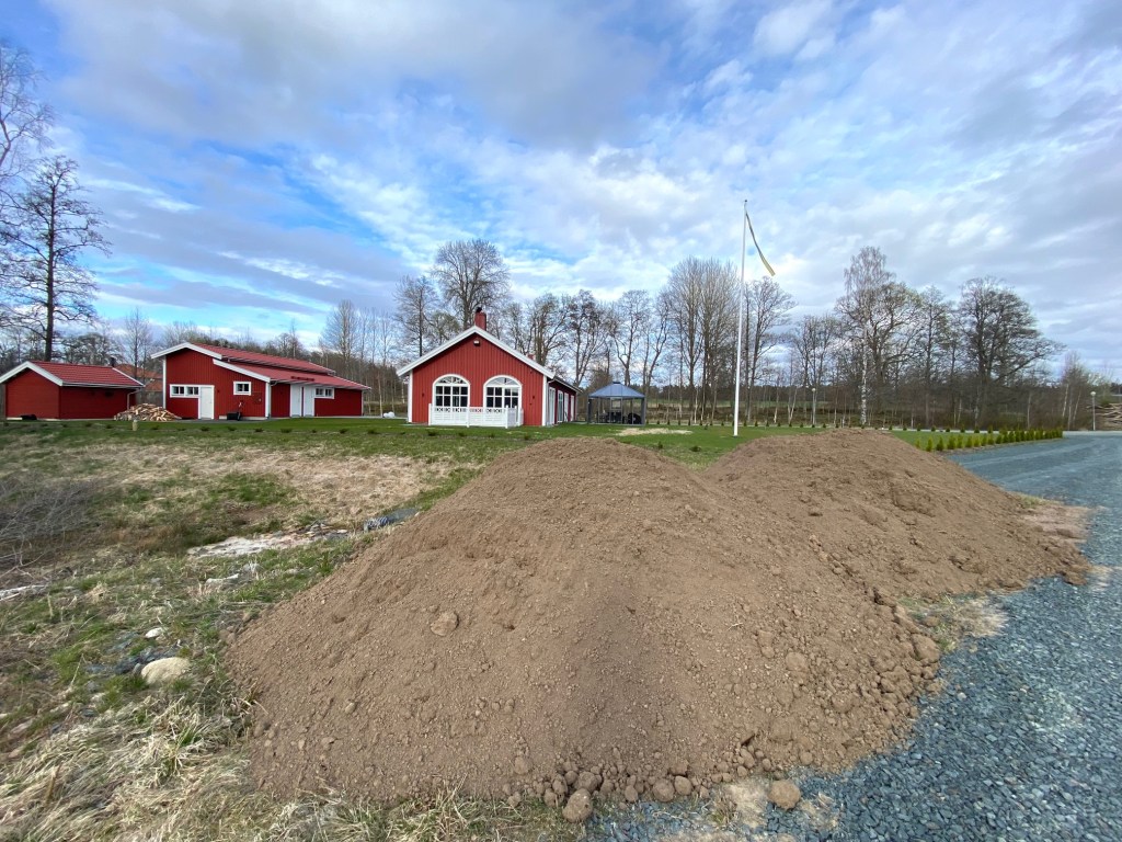 Jag hade beställt tre lass med matjord av Jonas Karlsson, KHA AB. Det dröjde så länge, så jag tänkte att han hinner nog inte i vår, utan då får vi ta det i höst. Men så skönt att få göra klart nu och få gräs till sommaren.