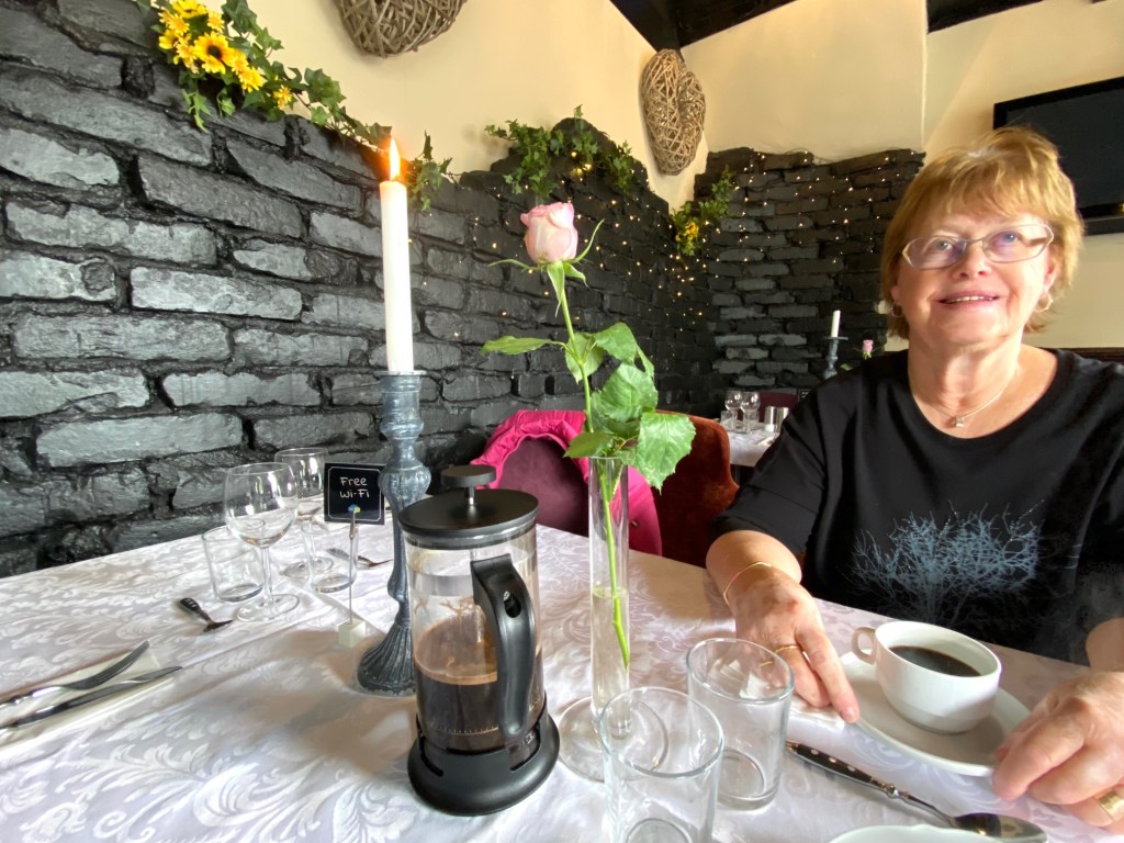 Vi åt Dagens rätt, som bestod av marinerade revbenspjäll, sallad och grillad klyftpotatis, inkl. kaffe, finkaka och lättöl, kostnad 119 kr per person. Jag hörde samma sak från andra gäster, ”Vilken miljö, så god mat och helt fantastiskt gott!” ”Var finns benen till revbensspjällen?” frågade jag. ”De är kvar i köket,” fick jag till svar.