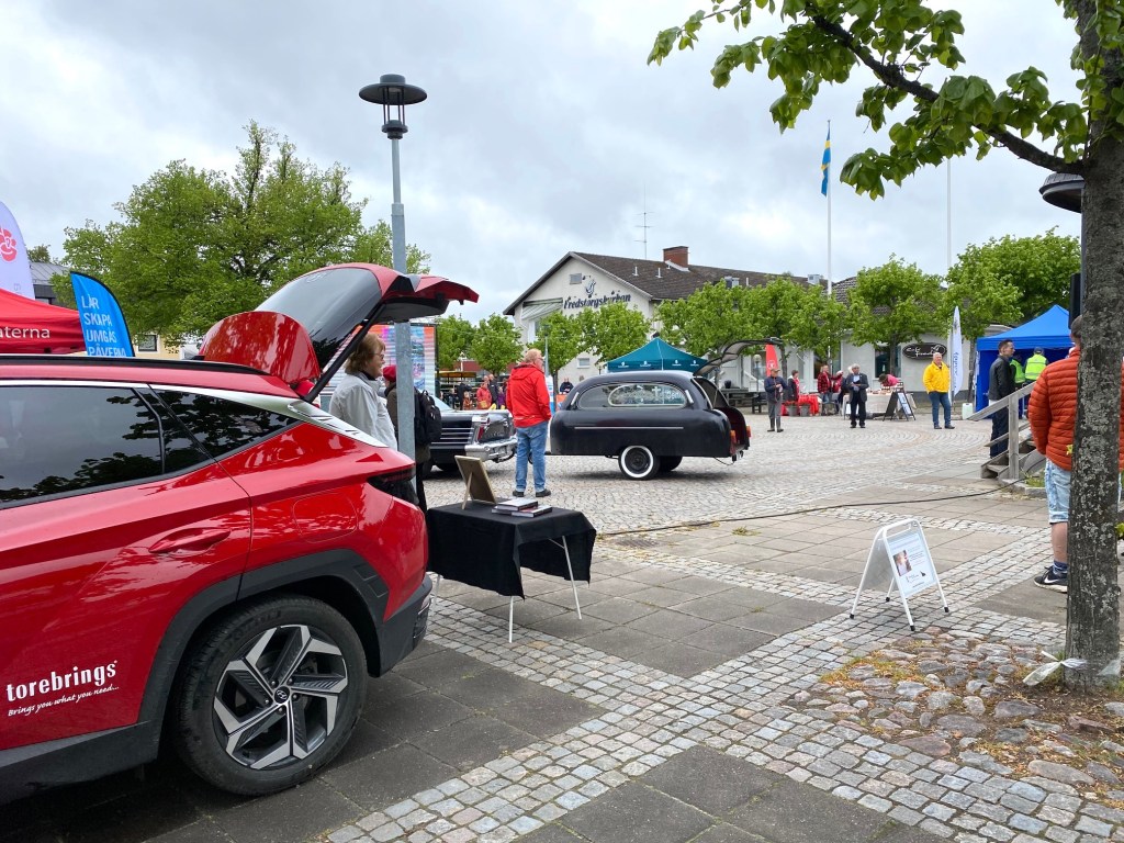 Flera gånger under natten vaknade jag av att regnet piskade på busstaket. Hur ska det gå att stå ute på Fredstorget i Aneby och signera mina böcker, tänkte jag? Dessutom blåste det en hel del och att skydda böckerna med ett parasoll testade jag aldrig. ”Jag behövde uppehållsväder” och fick det under förmidddags timmarna. När vi åkte hem började det att regna igen. Jättebra för vår gräsmatta hemma, ett stycke bort.