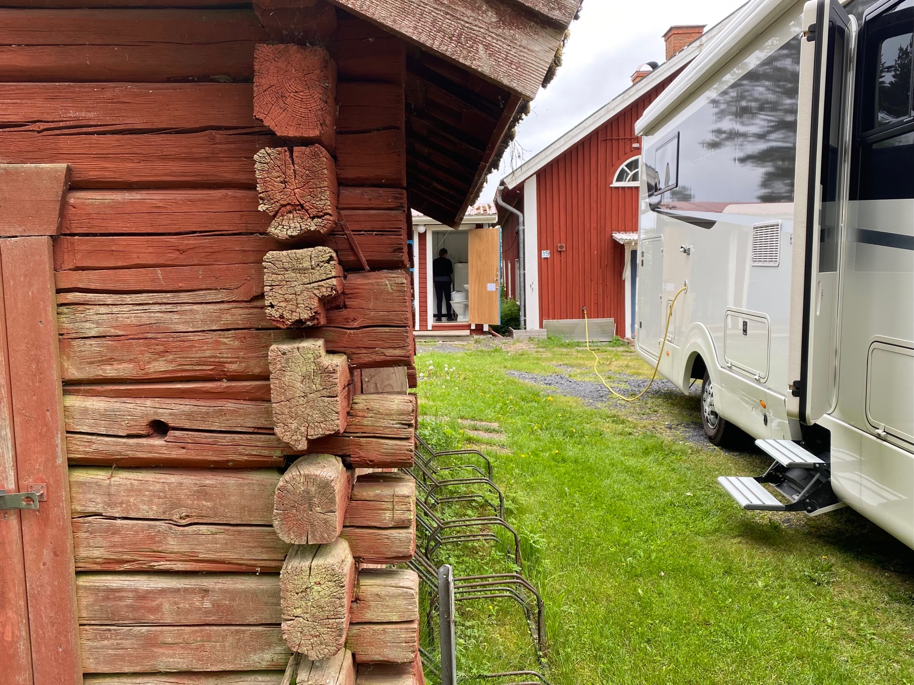 Vi lämnar den fantastiska platsen som vi hade vid Sommarhemmet Hult, ett par mil söder om Kristinehamn. Det fanns gott om soptunnor och färskvatten, men ingen möjlighet att tömma grå- eller svartvatten. Däremot lämnade vi Hult med full vattentank. Det tar en bra stund att fylla upp färskvattentanken och så skönt att göra det, när det inte står en kö bakom och tutar. Nu var det 5:e dygnet utan tömning eller fylla på.