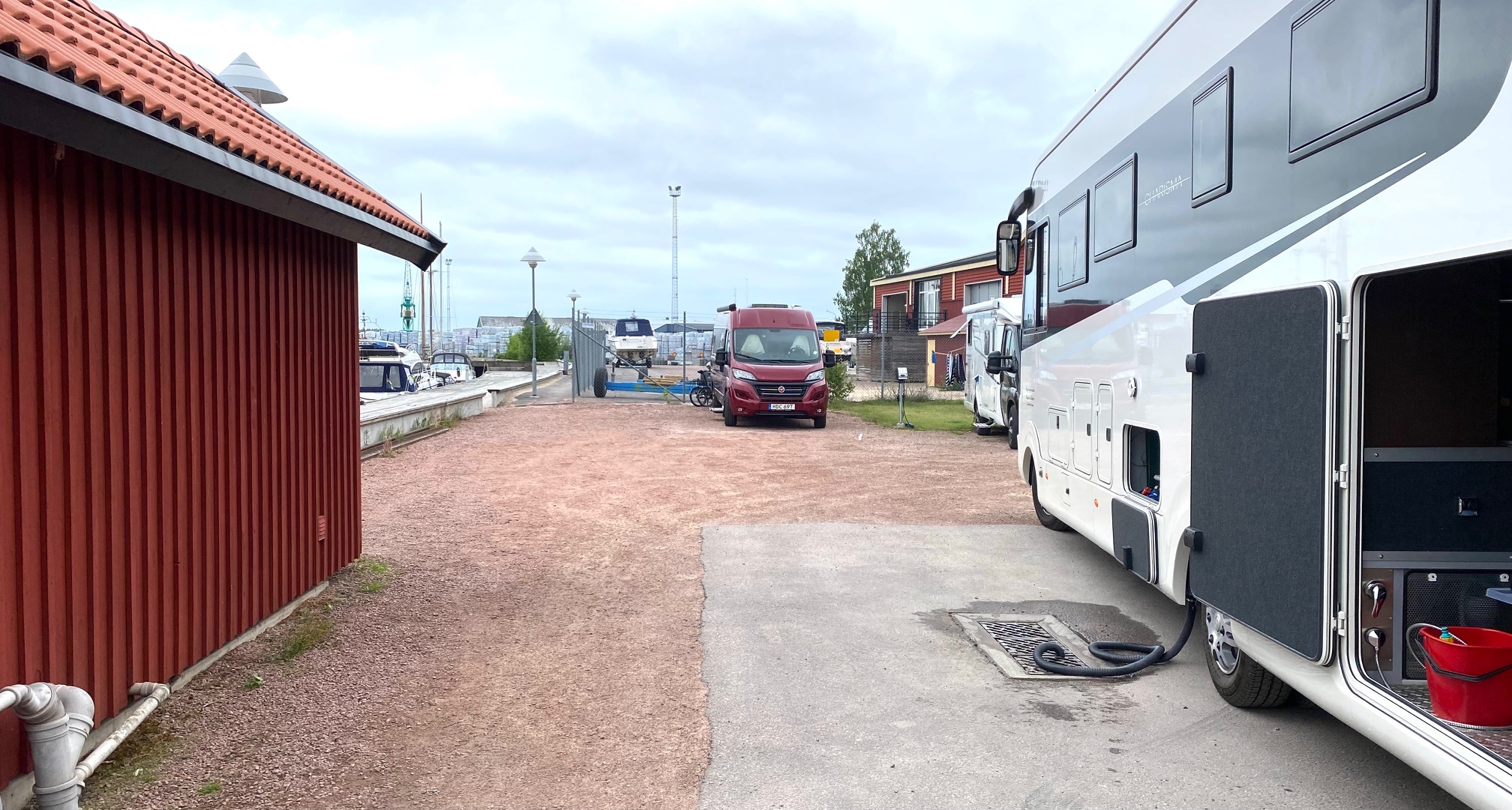 För att tömma grå- & svartvatten tog vi sikte på ställplatsen vid hamnen i Kristinehamn. Där kom en glad man, som själv körde Morelo, och tog emot oss med den största vänlighet. Så smidigt, så rymligt och inte kostade det något heller. Som tur var hade jag en Merci att bjuda värden på, som tack för detta trevliga bemötande.