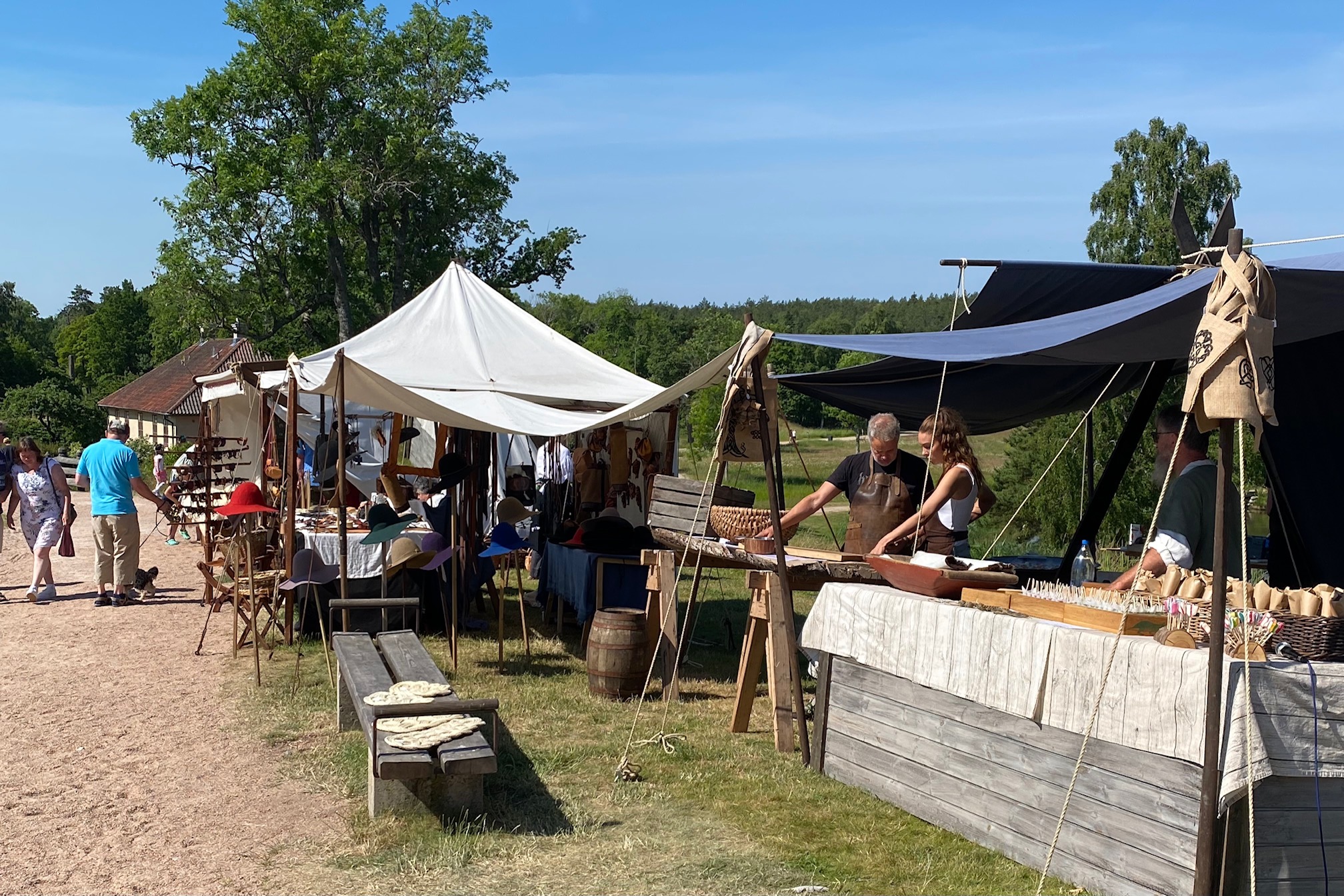 Jag har sökt efter midsommarfirande i bygden, men hittade inget. När vi kom till Läckö Slott så hade det varit firande där, med midsommarstång och en mindre musikscen. Det missade vi. Det fanns gott om marknadsstånd där ute, men vad skall vi köpa, vi har allt vi behöver. Vi har tidigare gått med i en guidad rundvandring inne i slottet.