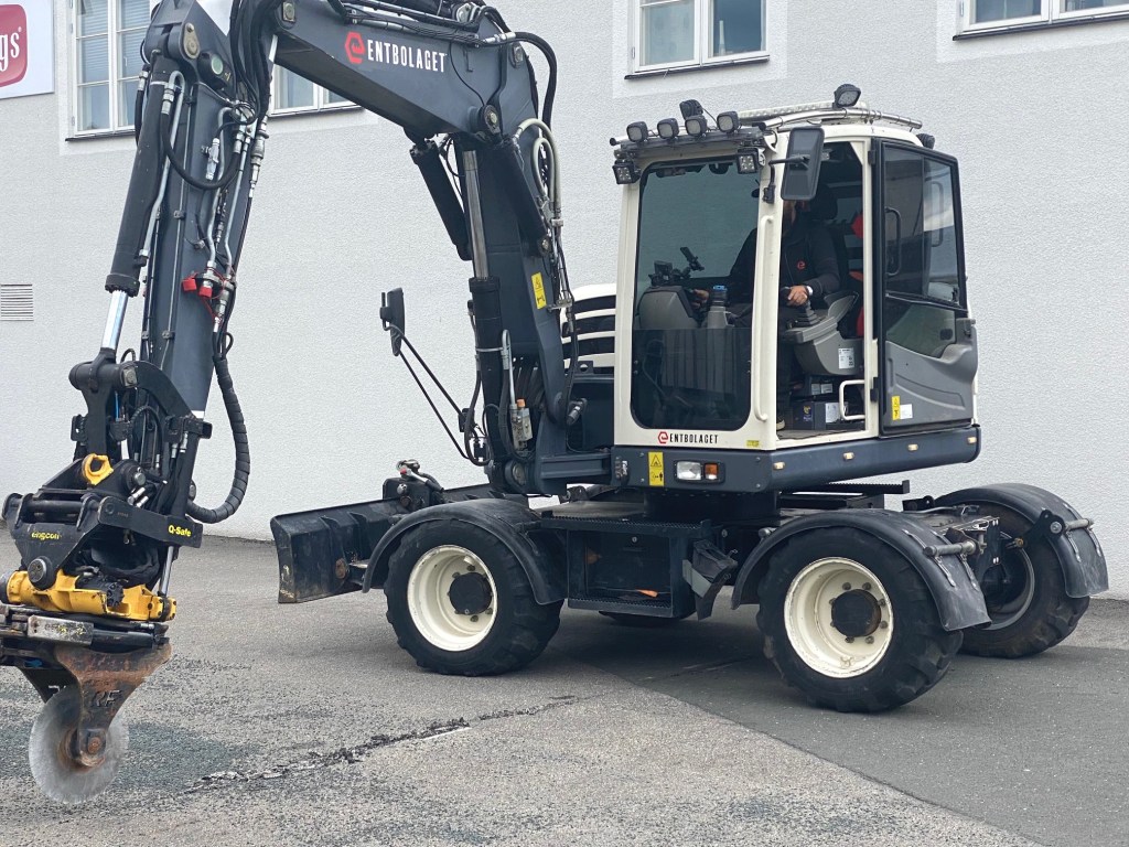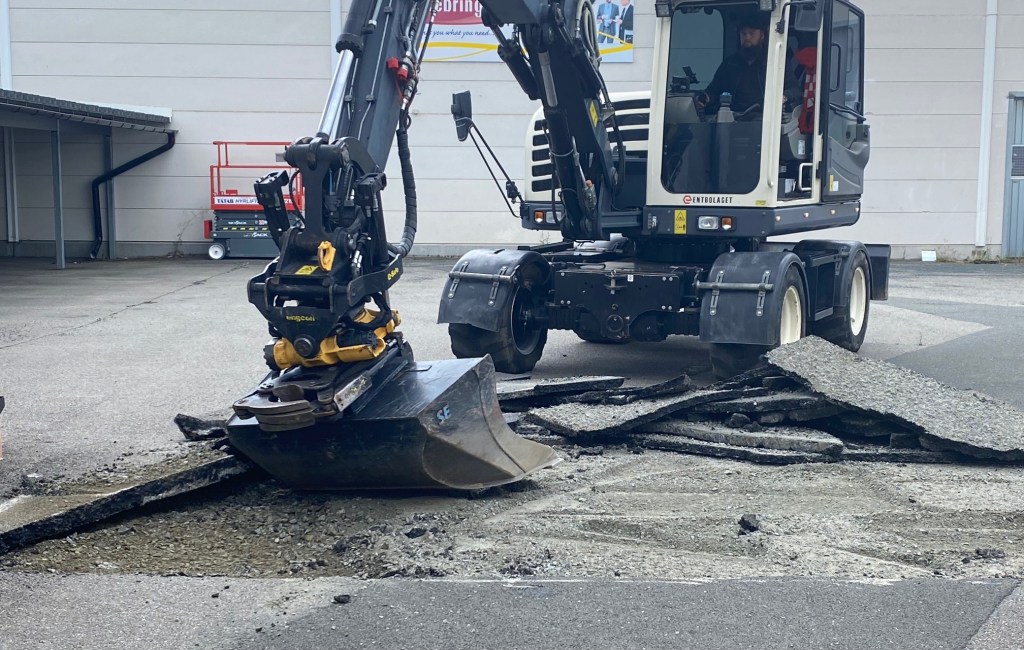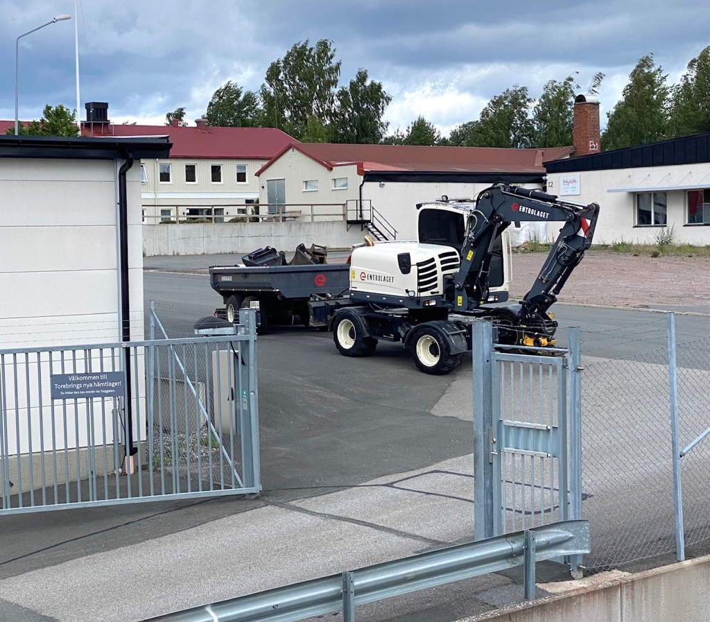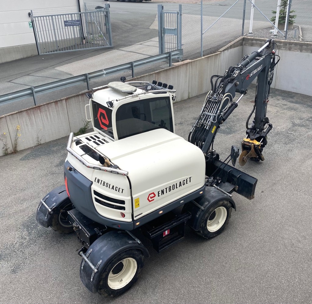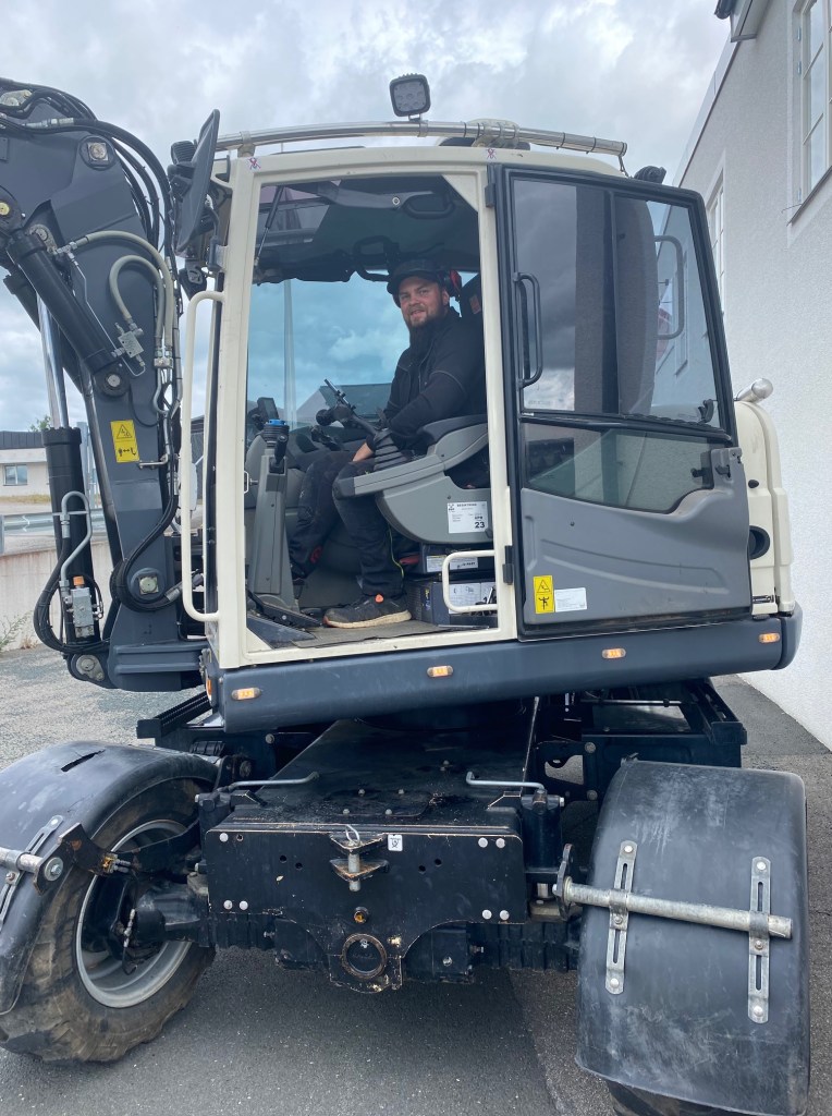 Jag sitter uppe på andra våningen på jobbet med uppsikt över gården. Så hör jag ett ljud bort igenom som låter som en grävmaskin. Hoppsan tänkte jag, den maskinen var en ny bekantskap för mig. Den har styrning på alla 4 hjulen och kan komma in i stort sett var som helst.