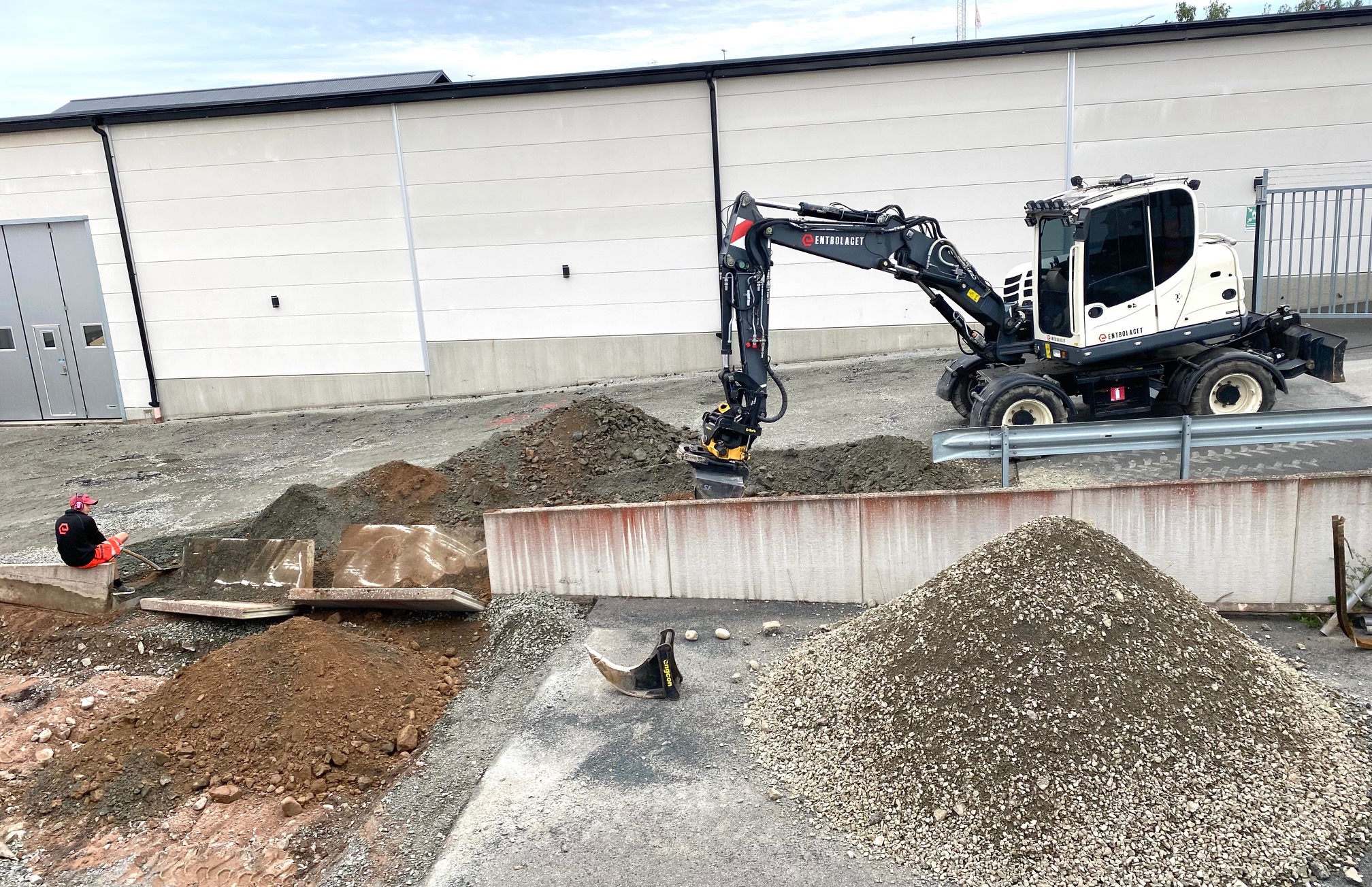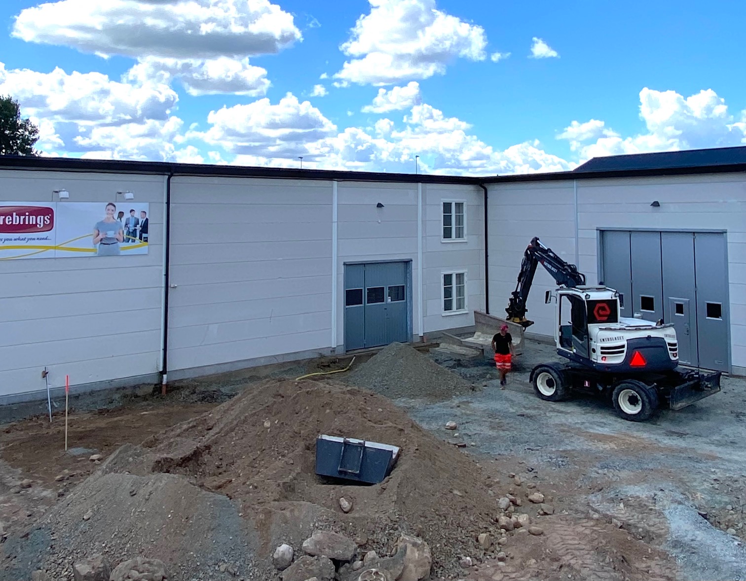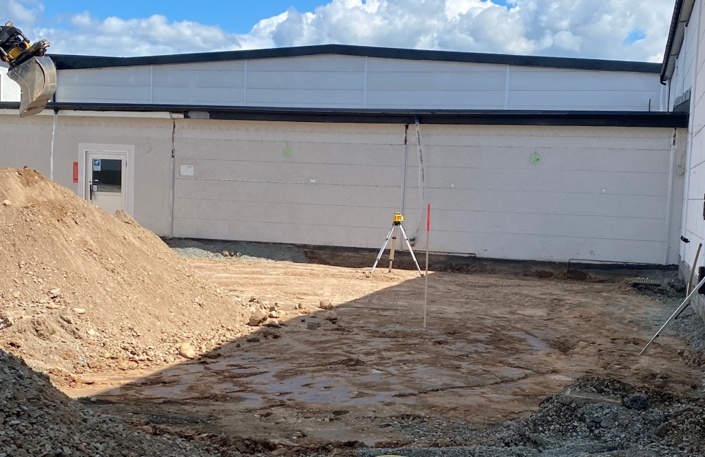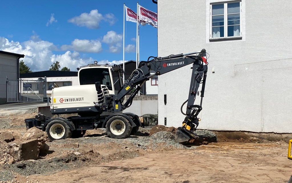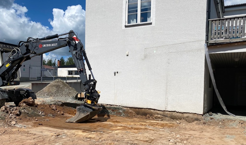 På bara fyra dagar har det hänt så jättemycket. I grävmaskinen sitter nu en ung grabb som sommarjobbar åt Entbolaget, men det märks inte, han är riktigt duktig. Redan är vi till stor del nere på rätt nivå som alla andra befintliga golv i hela fastigheten. Sedan återstår ett nästan gigantiskt grundarbete med att forma inför gjutningen för alla bärande delar.