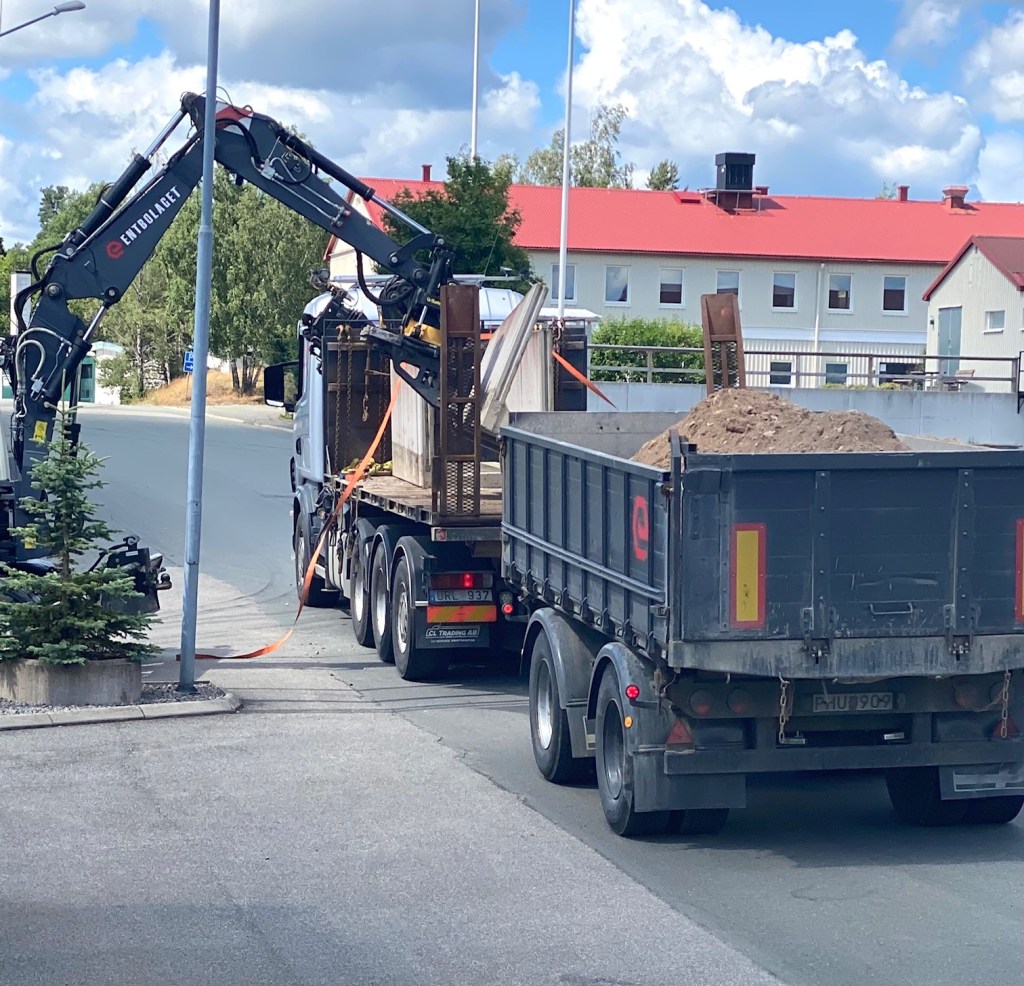 Lastbilen byte bara flak och lastar upp L stöden samt ett lass grus på släpet.