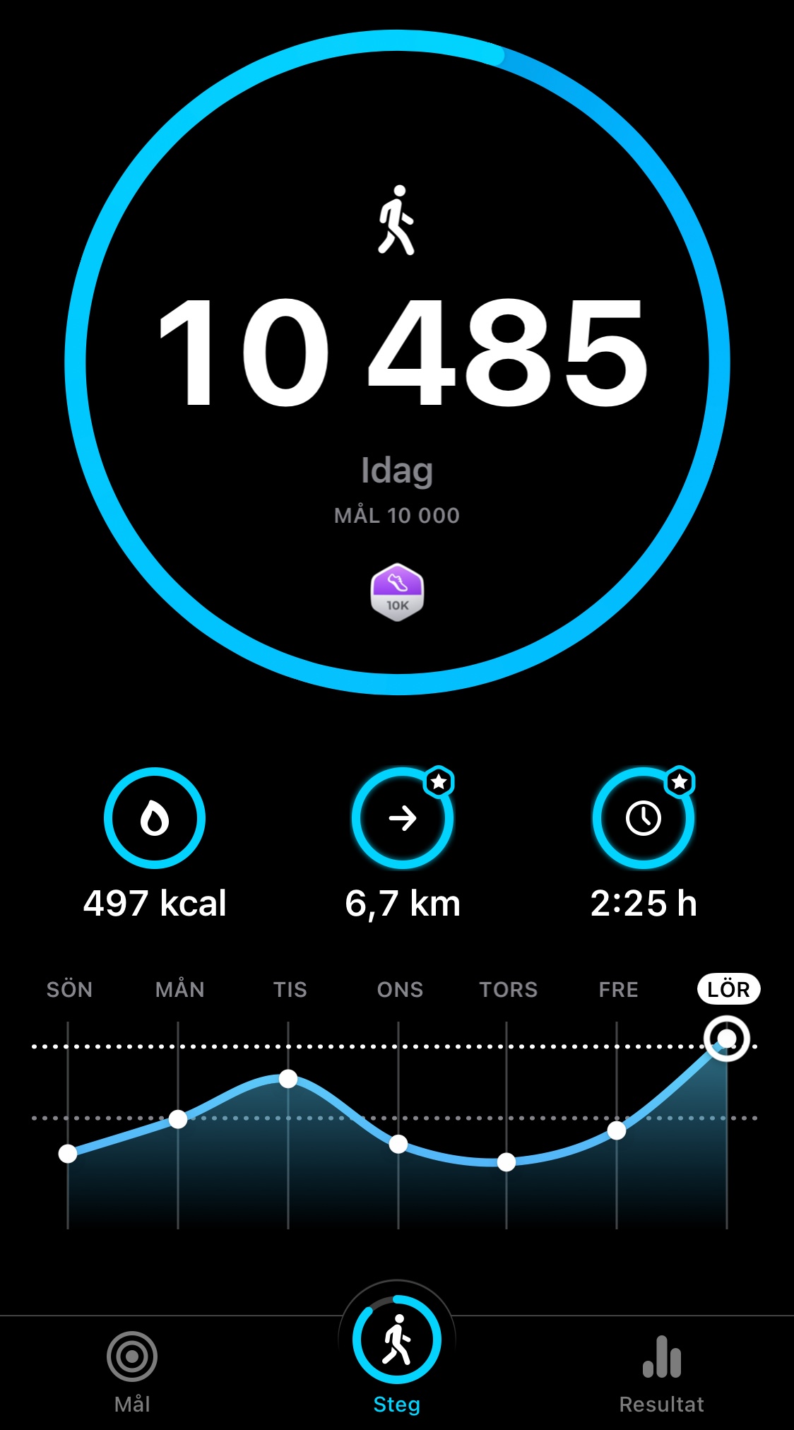 Gräsmattan är så stor att jag var lite ängslig, då jag inte varit riktigt piggelin denna veckan. Efter 2 timmar, cirka 6 km och cirka 10 000 steg var jag klar. Det var ju väldigt enkelt att klippa utan uppsamlare. Jag vill att gräsklippet skall ligga kvar och göda jorden. Gräsmattan är fortfarande inte bra, på grund av att vi var borta när det var som varmast ute, men det det mesta kommer att klara sig. Jag har vattnat jättemycket sedan vi kom hem. Förra året hade vi ett äpple, i år ser det ut att bli 10 stycken.