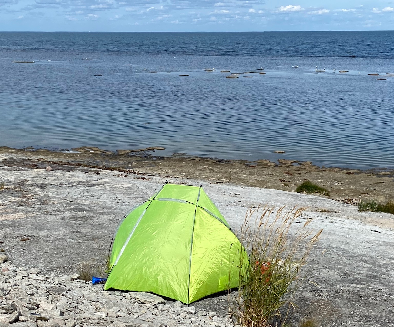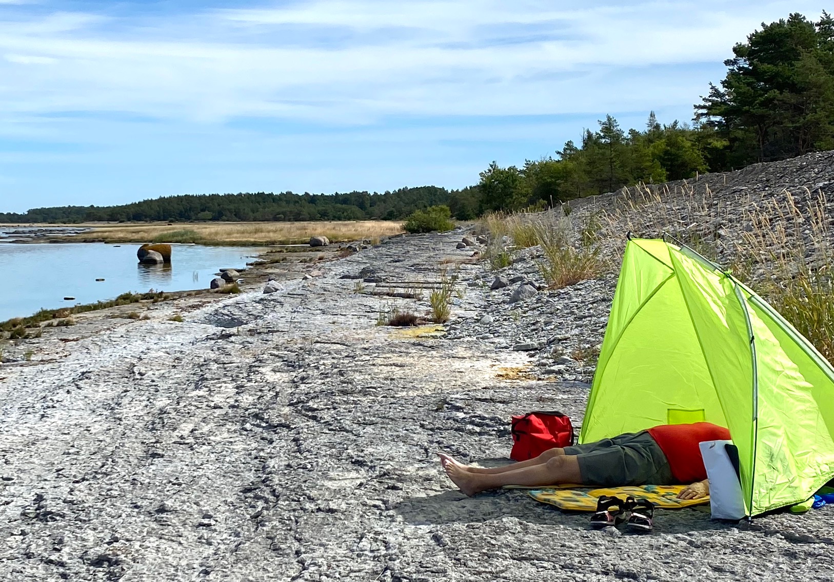Det ser skönt ut att inte ha några andra tätt inpå sig där ni ligger i vindskyddet. Stenig botten är inget vidare, vi har badskor som används om det skulle bli ett bad.