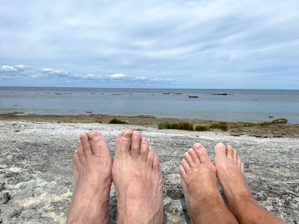 Varje gång vi har cyklat in till Byxelkrok, har vi sett gott om solande människor på klipporna nedanför branterna ut mot havet. Idag hade vi bestämt att vi skulle testa havet vid Neptuni Åkrar. Inte alls gästvänligt att komma ned till stranden i all denna sten. Längst uppe i norr var vi helt ensamma på stranden.