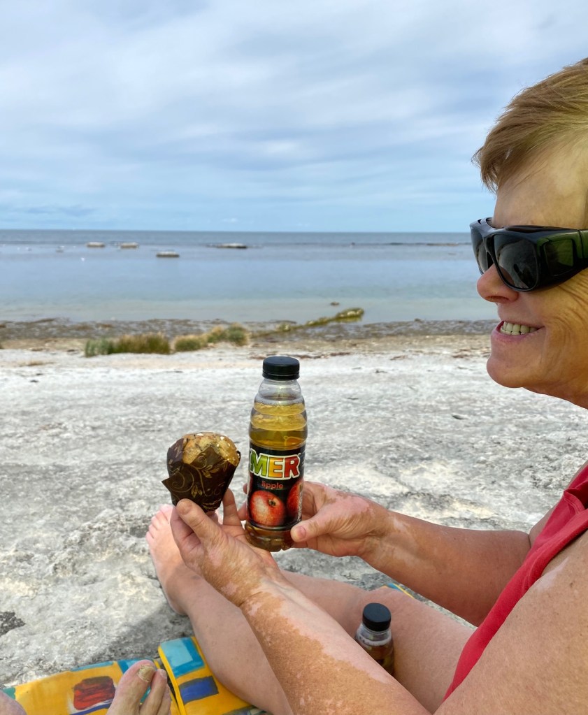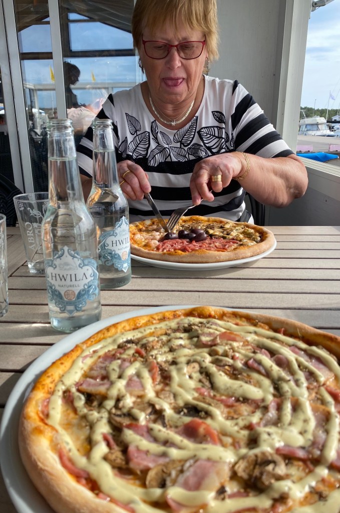 Vi strulade inte med att ta med oss kaffe idag. En muffins och vad Mer kan man önska sig. Dagen avslutade vi med var sin pizza på samma restaurang som igår, ”Alla går till Petters i Byxelkrok.” Denna tidigare folktomma by, som nu är som en stor marknad med många matställen, Gelateria och en massa krims krams.