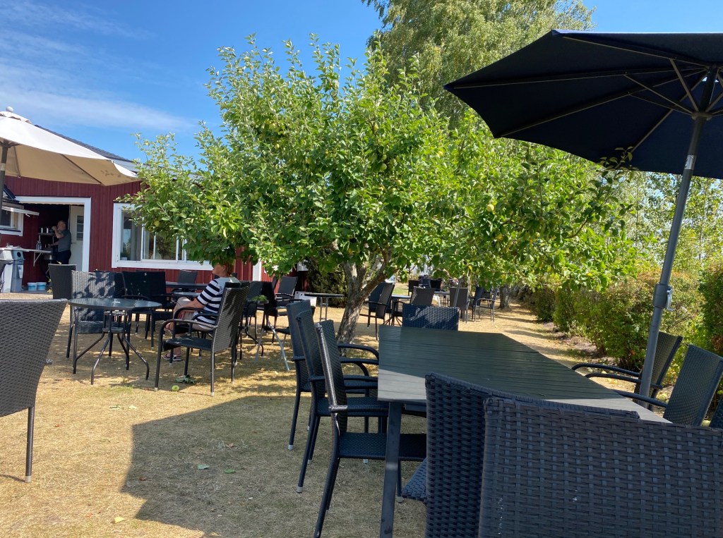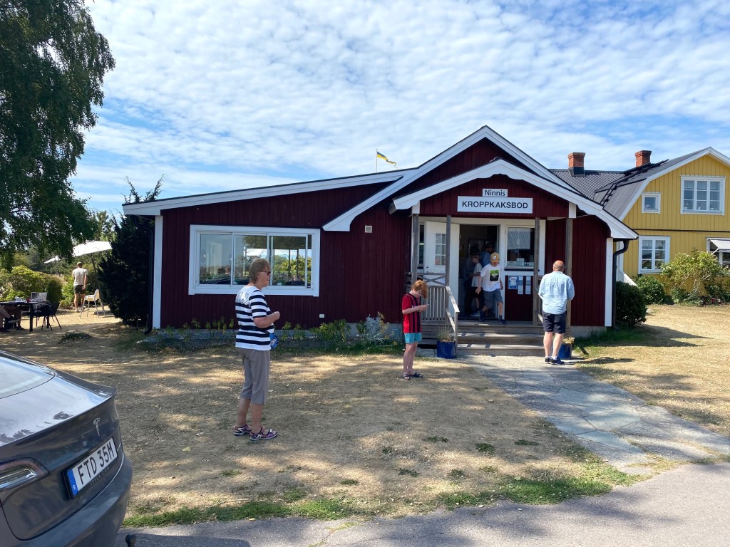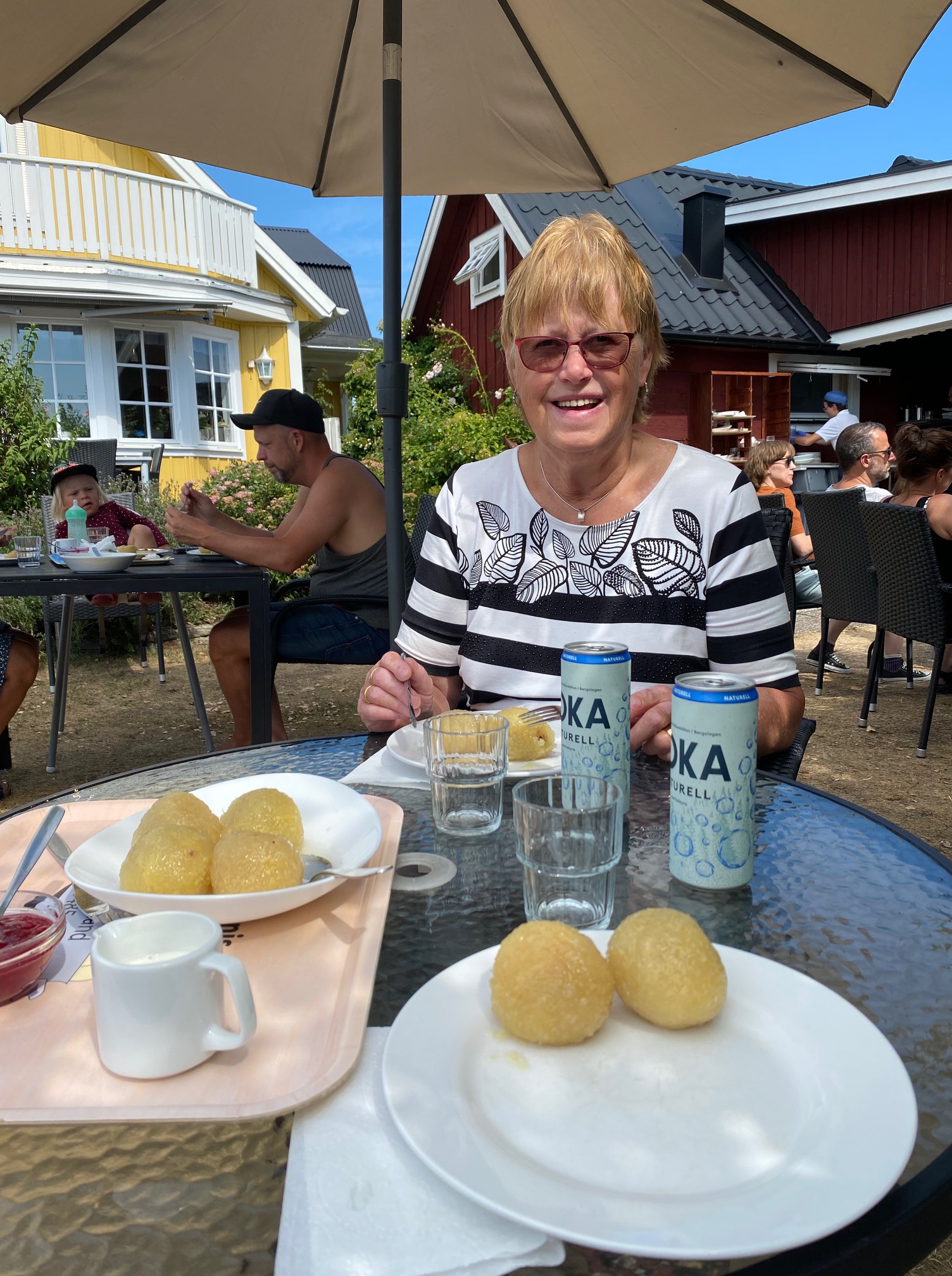 Vi har så nära till Ninnis Kroppkaksbod i Källa, så i dag cyklade vi dit. Från det att vi lämnade vår fina ställplats, (som är bättre än många campingplatser), till dess att vi ätit klart tog det 30 minuter enligt Birgitta, detta trots att det var kö ut på trappan när vi kom dit. Vilken smart affärsidé att servera så många och så snabbt.
