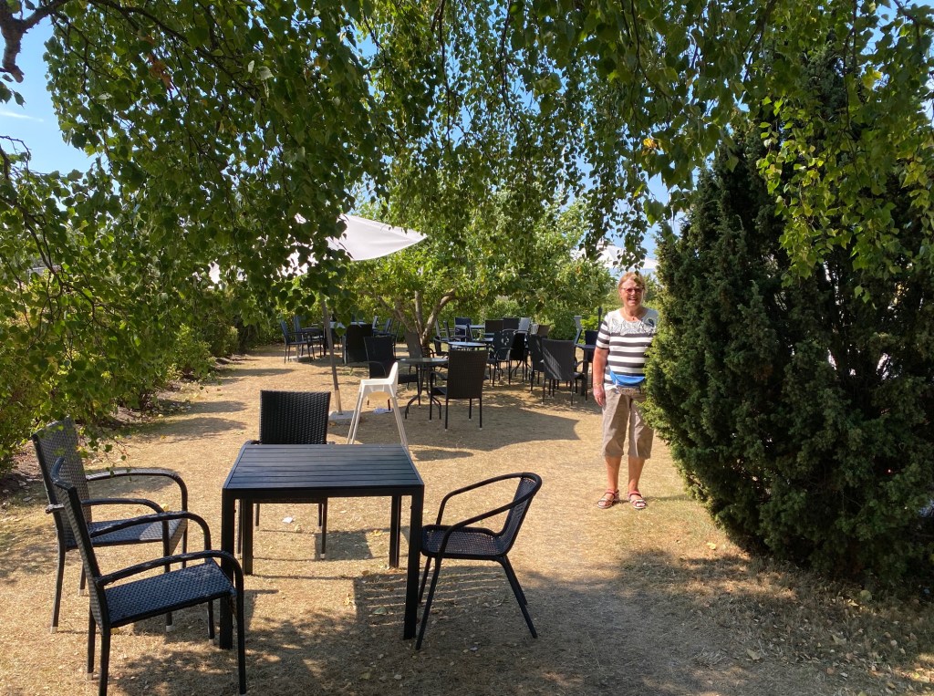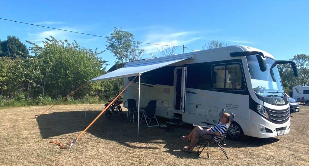 Att få en plats som denna på en ställplats är ju helt fantastiskt. Markis, bord, stolar, solstolar och cyklar, allt ute över natten. Bara att gå ut och sätta sig till frukost och inta jordgubbarna från gårdsbutiken ett litet stycke bort.