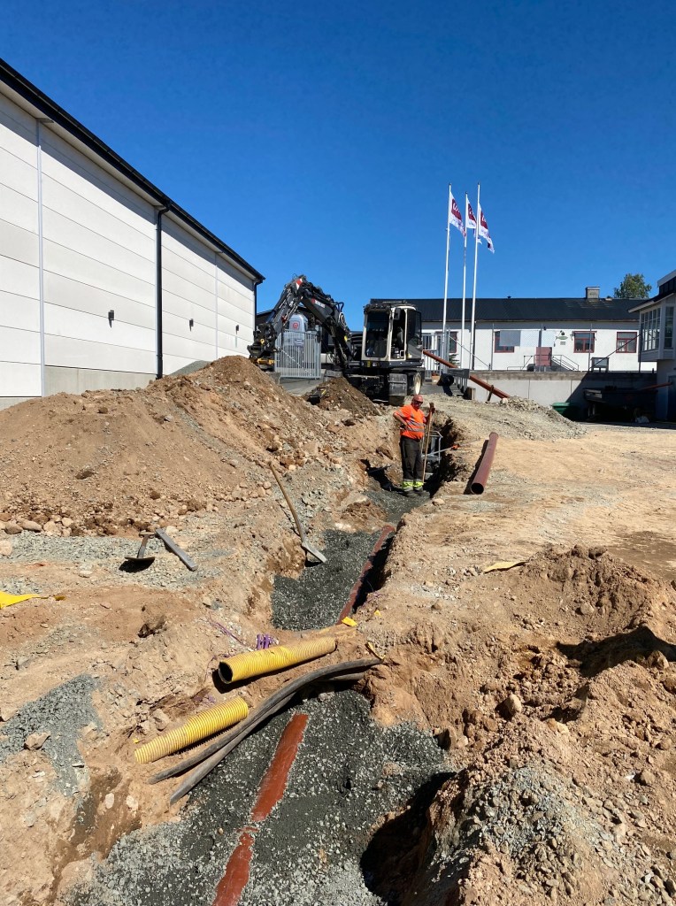 I en fastighet som denna, har det hänt mycket under årens lopp. Den äldsta delen byggdes i slutet av 40 talet. Sedan har det skett tillbyggnader på 50 & 60 talet. Sedan har vi byggt till 1996, 2002, 2007, 2011, 2018 och nu 2022. När grävmaskinen går på djupet hittar vi många olika rör, men även berg och snubblande nära att få spränga.