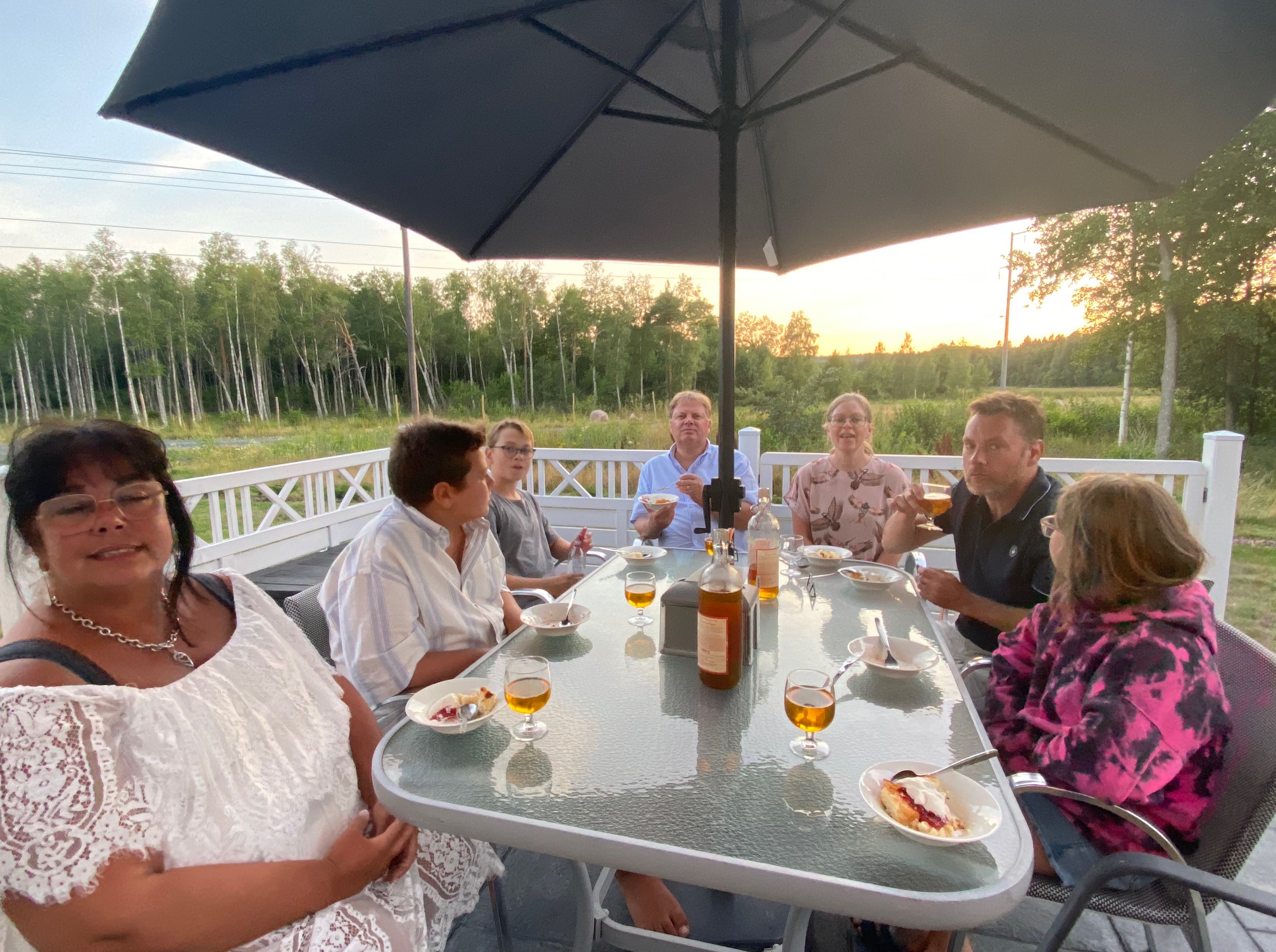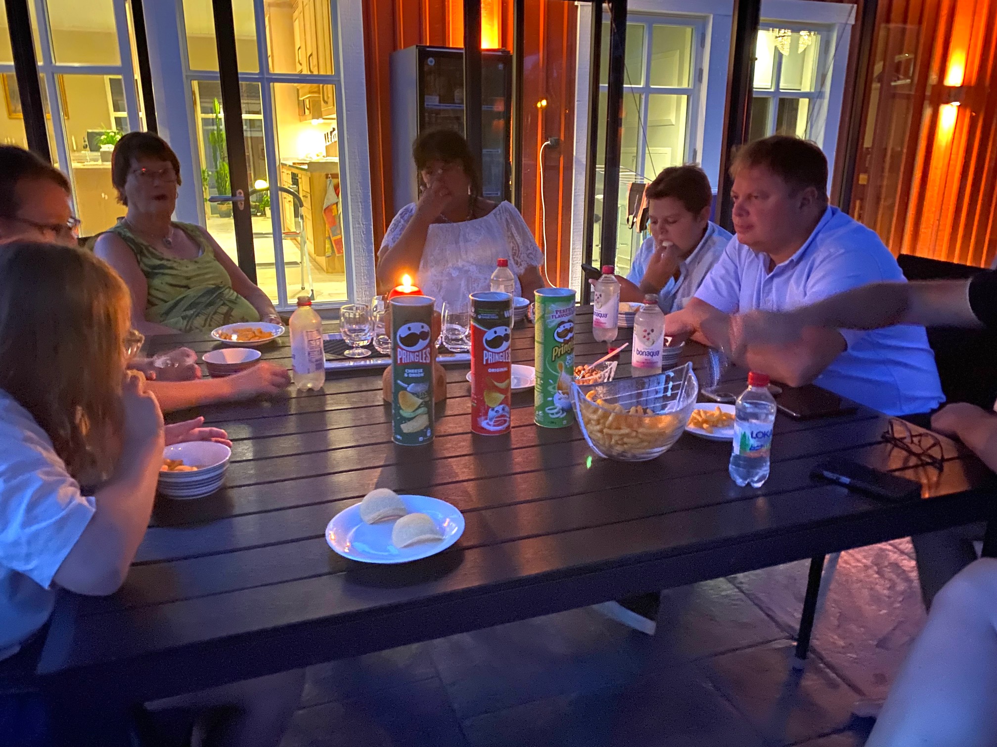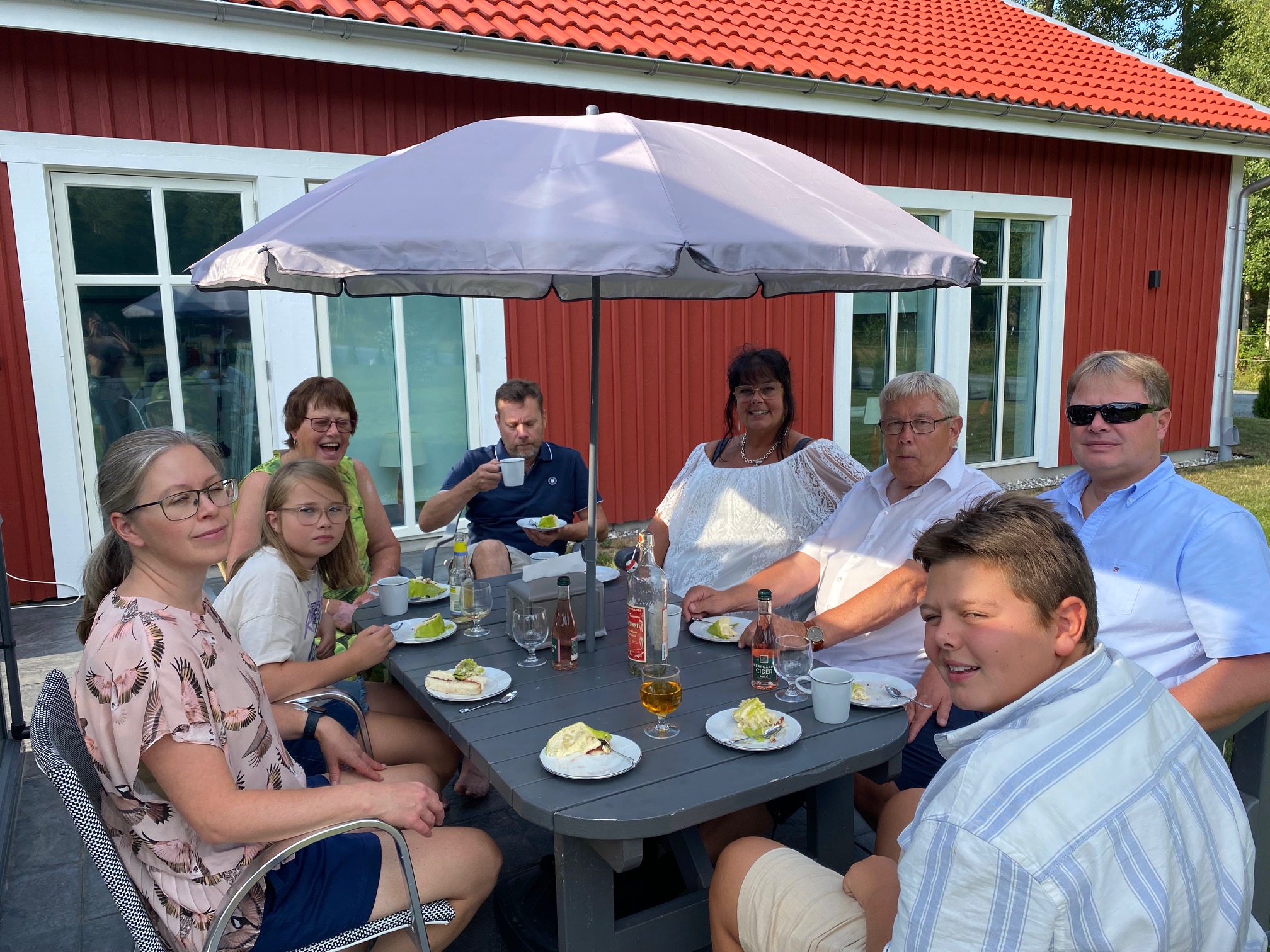 Tack, tack … Jag hade nog mest ett par tankar i mitt huvud … Vad skönt att det inte regnar, vad skönt att det är bara familjen och att vi var bara 9 personer. Ett så stort kalas som ditt och med så många gäster, är inte enkelt att fixa i denna värme. Själva kan vi vandra runt huset och söka skugga, samt att vi har AC i vardagsrum och i vårt sovrum.