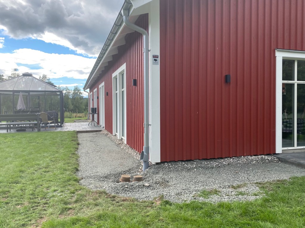 Det där blir bra. Och säkert bra för huset med. Gräsmatta finns ändå och nu bara att hålla kanterna fina. Blir mer lättskött allt.