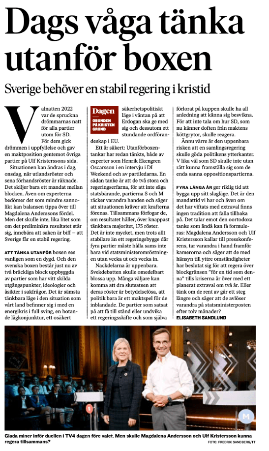 Idag tycker jag och många andra, inte minst den ledarskribent som jag aktar högst av alla, Elisabeth Sandlund, Tidningen Dagen. Uffe & Madde satt i samma stridsvagn under Nato förhandlingarna. Senast satt de i Statsministerduellen i TV 4 och var riktigt lättsamma och trevliga tillsammans. Visst skulle de kunnat sitta i samma bås igen. Då hade ytterlighetspartiernas möjligheter att påverka fallit till marken.