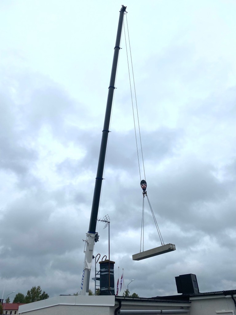 Nu i skrivande stund är takstolarna på plats och det tog bara drygt en timma.
