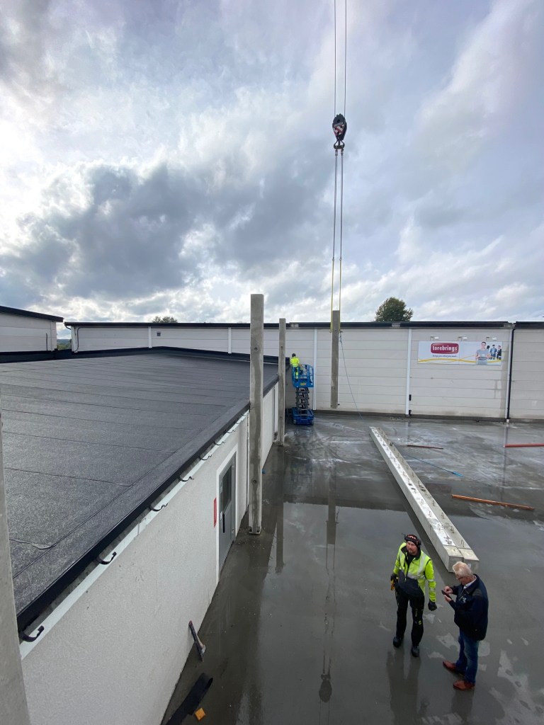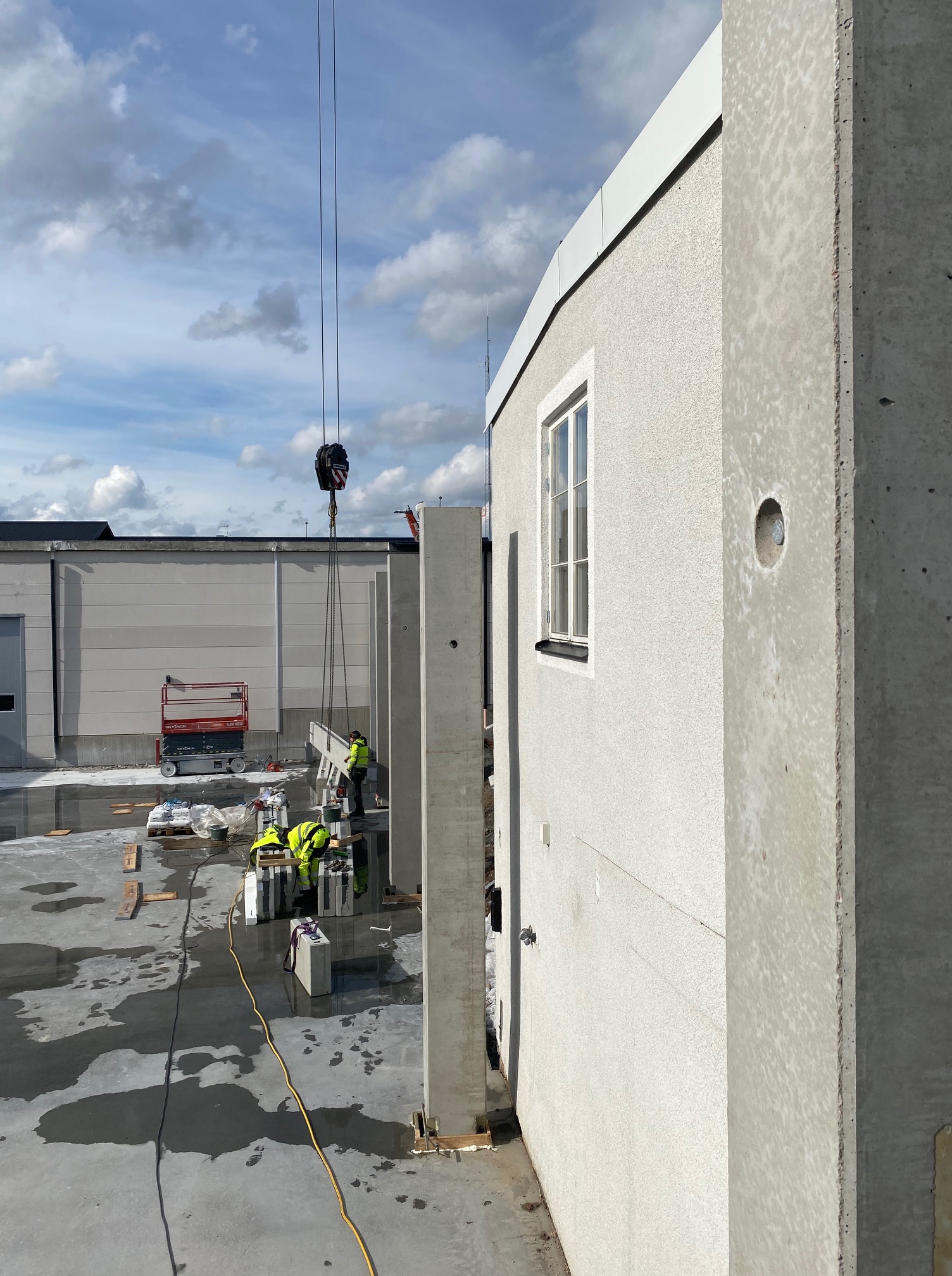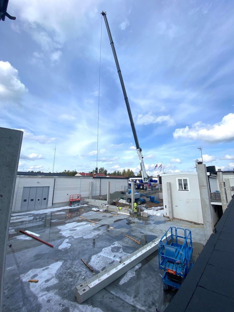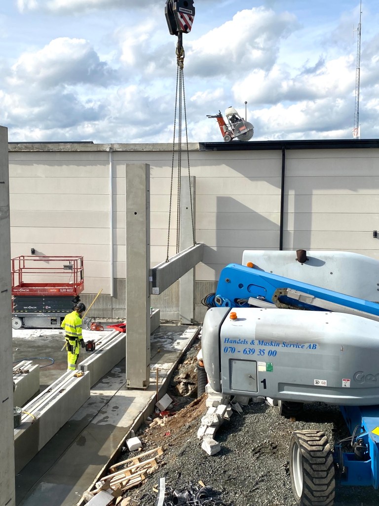 I morgon kommer takstolarna i en ny leverans. Sedan kommer det en mindre mobilkran till resten av tak och väggar.