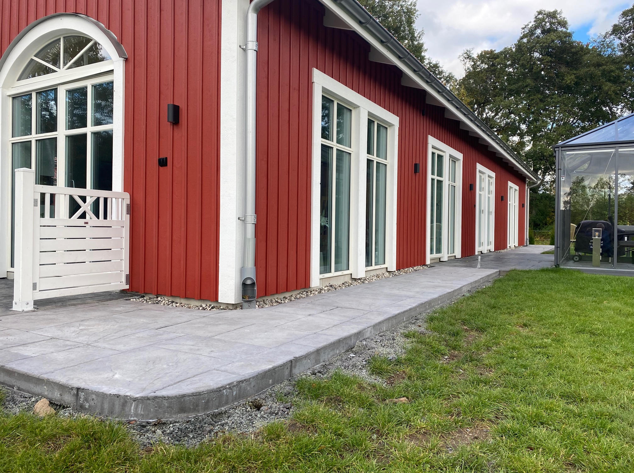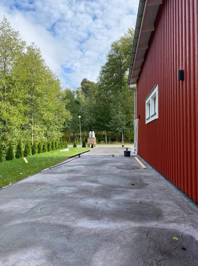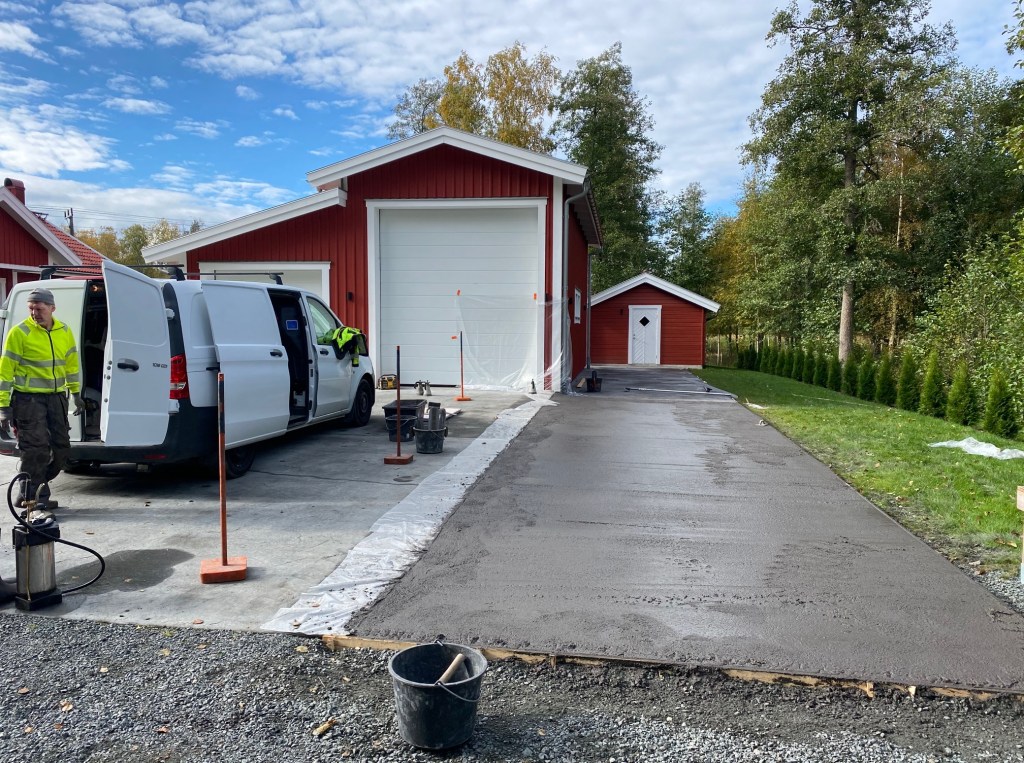 Att betongbilen skulle komma hem till oss idag var klart sedan tidigare. Varje dag har SMHI lovat regn utom idag. Betongbilen kom, men inget regn. Vi kunde gjuta klart sista halvan på infarten till Friggeboden. Vad smidigt det blir nu att rulla in släpkärran, båten och inget ogräs kommer upp.