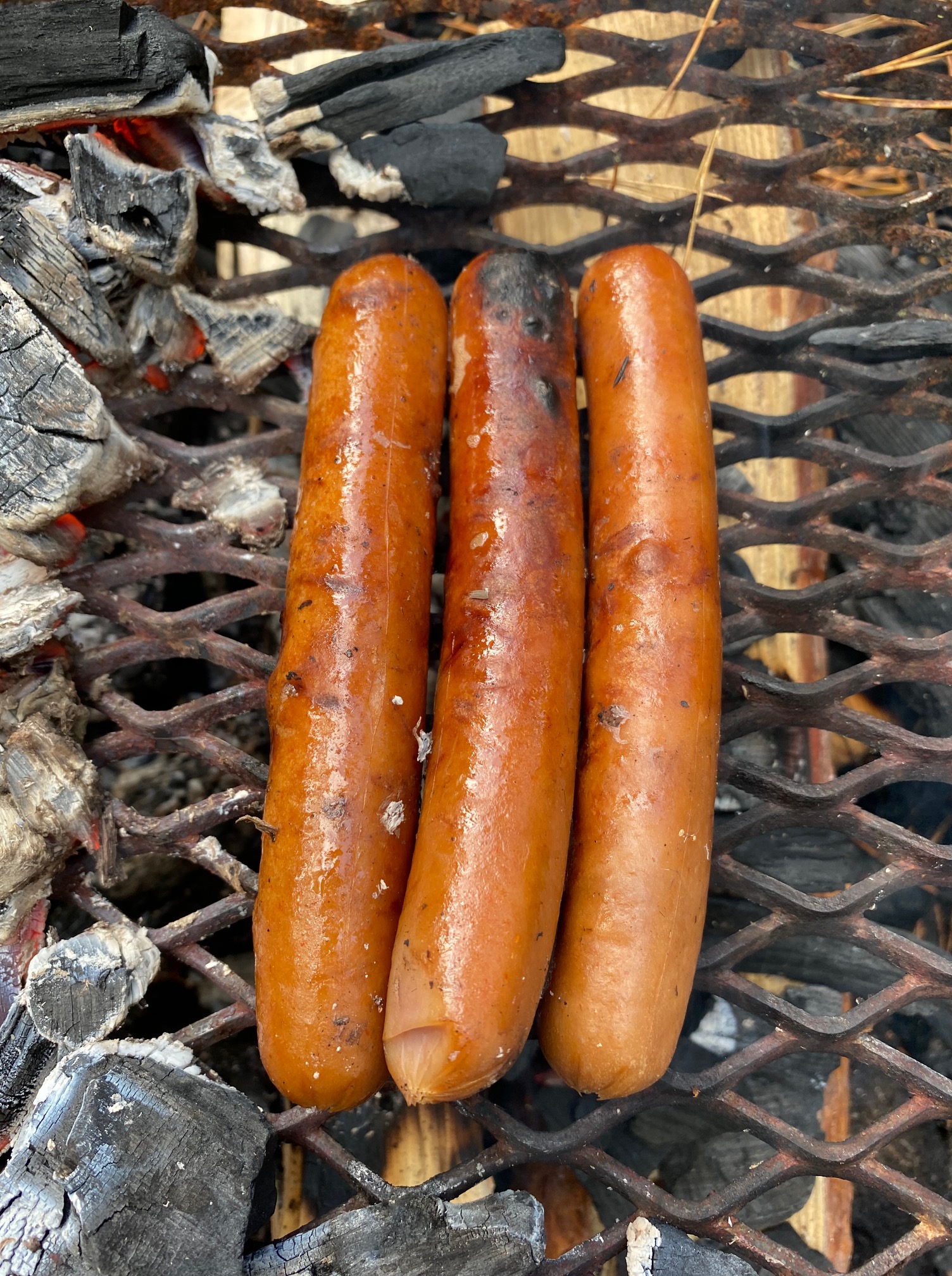 Idag stoppade vi ned några korvar i en kylväska och traskade iväg. Vi har bara 2 km att gå till denna utsökta grillplats. Det kändes bra för mig med rast och vila på halva sträckan. Visst är det konstigt att sex lite sotiga korvar smakar bättre på glöd i skogen, än hemma på stekpannan.