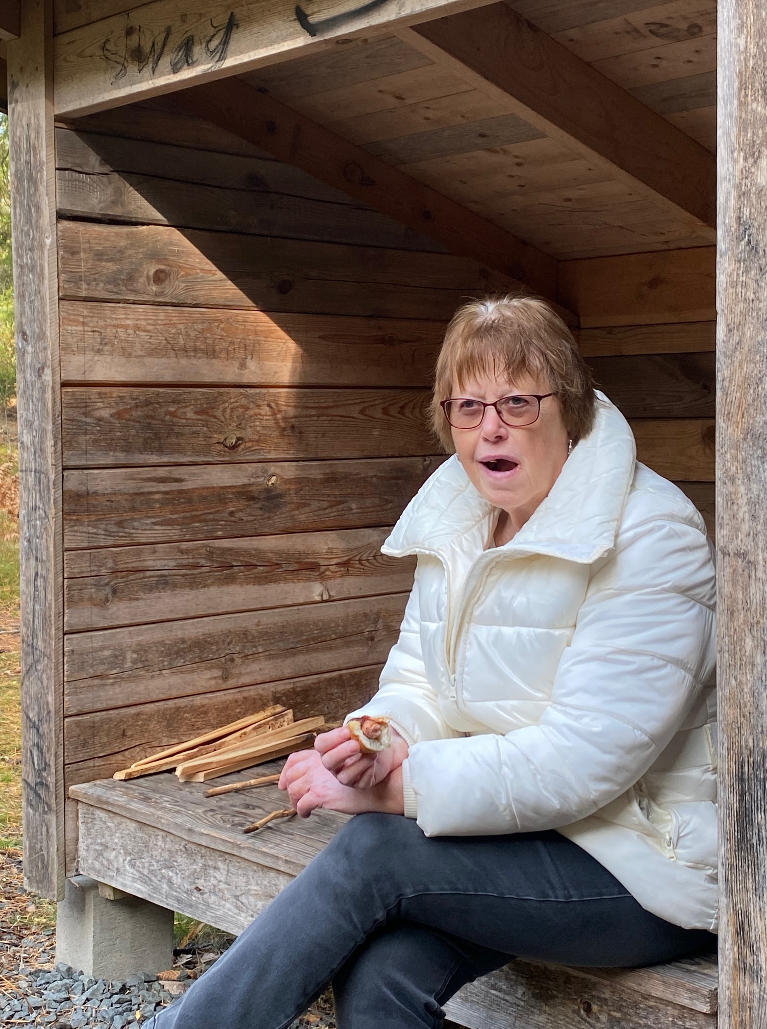 Visst är det inne att äta ute igen. Förra söndagen åt vi på en Golfrestaurang på en Herrgård, idag ute i skogen.