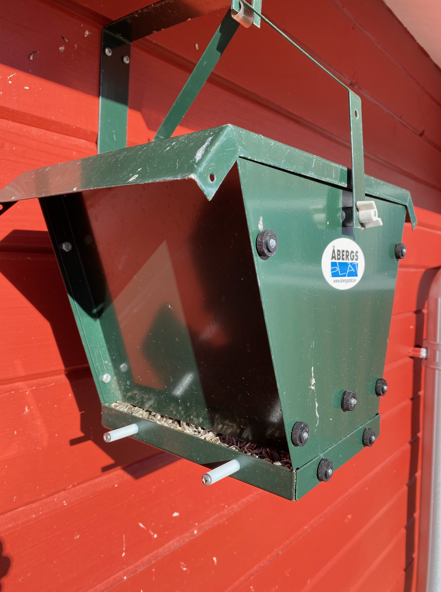 Våra fågelbord hittade vi på en marknad i Hjo för 10- talet år sedan. En ornitolog hade lagt mycket tid och kraft åt att utforma ett fågelbord där inte fåglarna kan bajsa i maten och bli sjuka och dör. (Nu bajsar de på väggen) Denna är avdelad i 2 fack på insidan, men eftersom de gillar Solrosfrön mest, fyller jag samma sort i båda facken.
