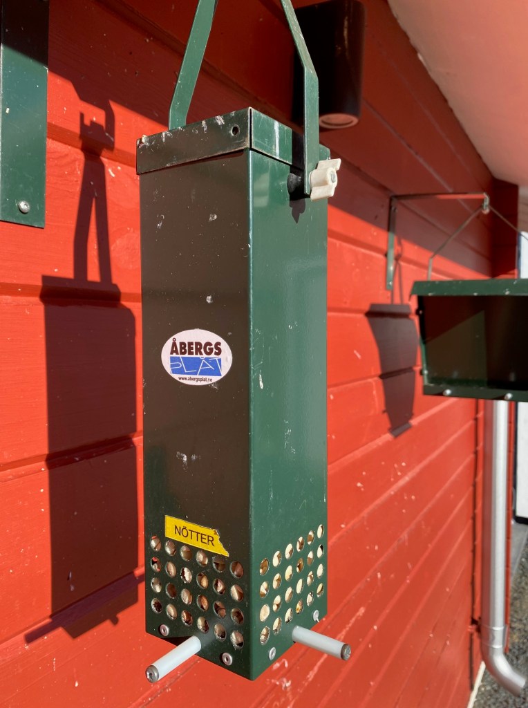 Det är extra roligt att se alla fåglarna från vårt panorama rum, vi ser ”skådespelet” hela tiden. Någon berättade om att de gjort ett enda större hål i sin ”nötautomat”. Sedan slogs fåglarna om just det större hålet, för att få med sig hela nötter.
