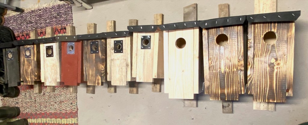 Vi hittade superfina fågelholkar på Facebook, hemma i garaget hos riktigt trevliga och fågel älskande pensionärer i Forserum. (nära Nässjö) Mannen tog med motorsågen till skogen och letade ut lämpligt virke, som han sedan sågade bräder av i ett eget mindre sågverk. Vi köpte 10 st fågelholkar, 3 st för starar och 7 st för småfåglar. De mindre bara 100 kr st.